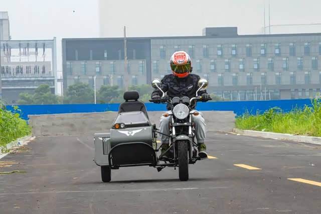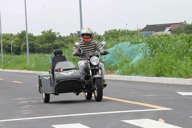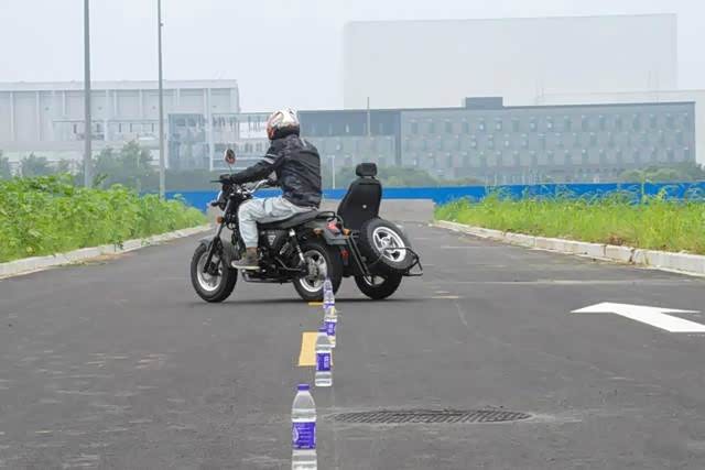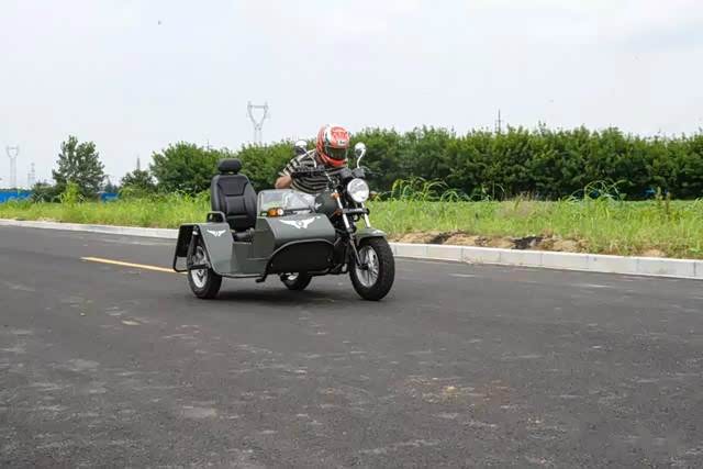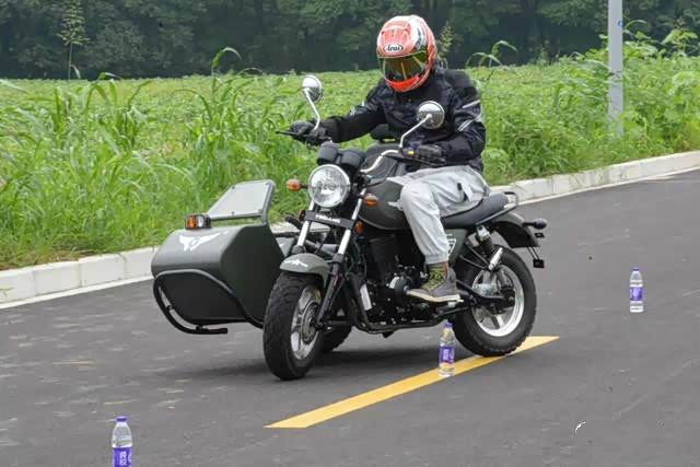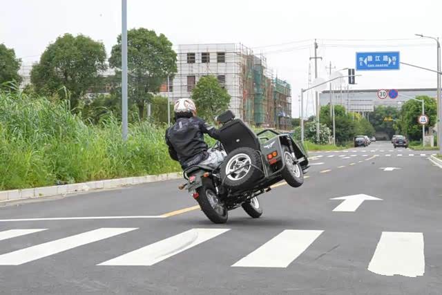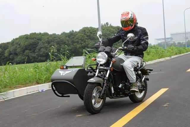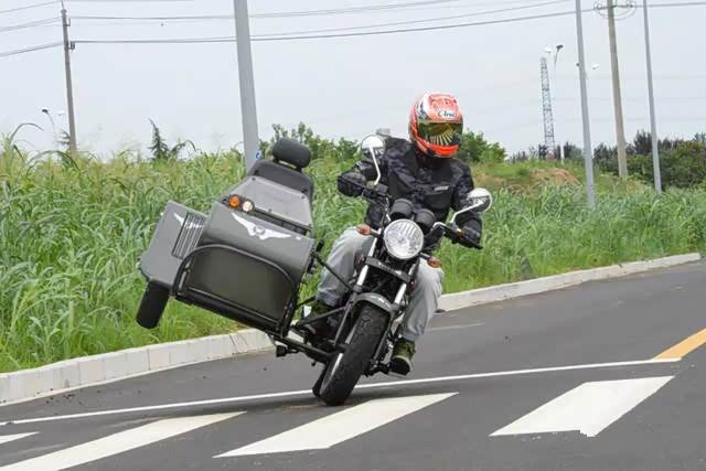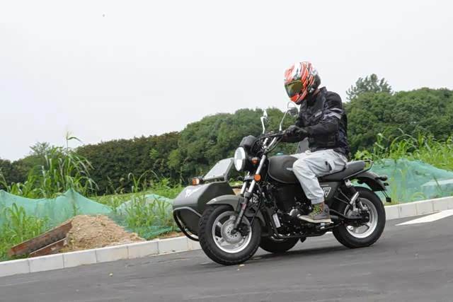 用身体控制一体把转向的方向,过弯时离心力的变动,挎斗会有一个外抛,在约35km/h的速度下轮胎有些吃不住地面,轮胎有一定程度上的滑动,车身总体是较为稳定的,没有起伏和晃动感。
