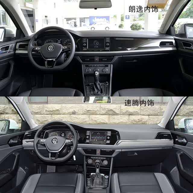 在内饰方面,两者相差不多, 朗逸采用对称式设计,整体有着比较浓厚的大众气息,而速腾的中控台偏向主驾驶,更加有符合当下消费者的审美与使用要求,方向盘、空调控制面板以及档杆区域两者都采用同样的布局,没有很大差别。