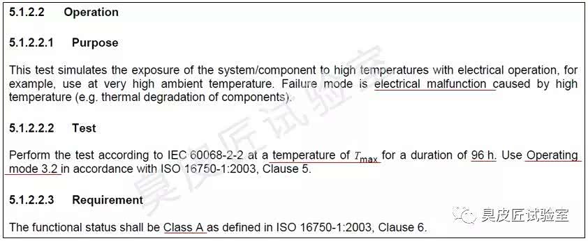 ISO16750-4 5.1.2.2 和ISO19453 5.1.2.2中关于高温运行试验的要求类似,详细描述如下: