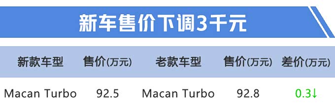 车家号·0浏览·2019-08-30 09:21 · 北京8月29日,网上车市从保时捷官方获悉,保时捷发布了新款 Macan Turbo(参数|询价)的官方图片,同时新车也在国内市场正式上市,共推出1款配置车型,官方售价为92.5万元。新款Macan Turbo换搭一台2.9T发动机,取代了老款车型的3.6T发动机,动力参数、百公里加速表现均得到明显提升。