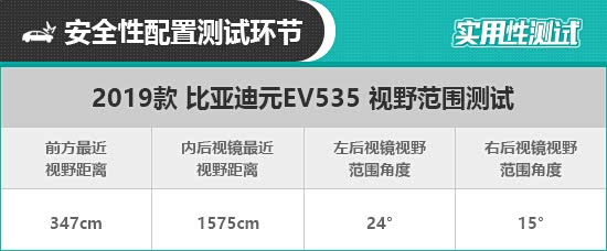 2019款比亚迪元EV535并未配备双曲率镜片,不过实测左侧24°,右侧15°的可视角度还算令人满意,高于测试过的同级别车型的平均水平。