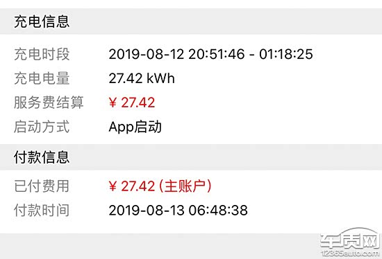 动力方面,新车高配版装配了一台最大功率120kW,峰值扭矩280N·m的永磁同步电机,匹配单速变速箱。动力电池也与老款车型相同,搭载了53.22kWh的三元锂电池,电池组密度达到了160Wh/kg,工信部给出的新车续航里程为410km。新车提供慢充和快充两种充电方式,实测时车辆快充有过一次中断,不知是否为个体现象。在快充模式下,电池温控系统会积极介入,从而保证电池时刻都能处于安全且稳定的工作温度。实测电量从58%-100%,共计需要4.2小时,共计花费27.42元。