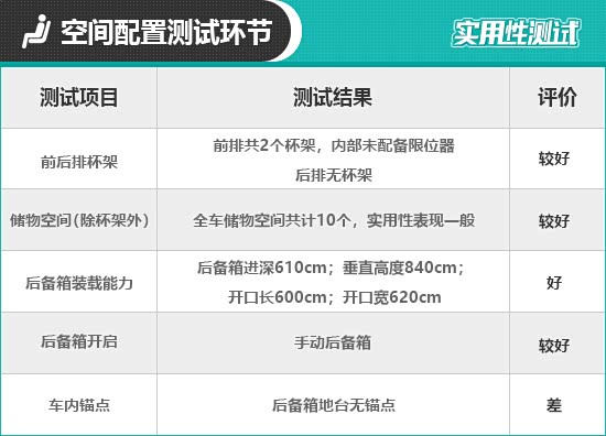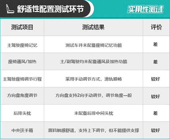 测试车辆并未配备座椅记忆功能,此外座椅加热以及通风功能也均未能出现,虽然配置看起来有些寒酸,但结合车辆定位以及售价,如此表现倒也基本符合预期。座椅采用手动调节方式,无论是拨杆手感还是滑轨的顺畅程度都能令人满意。方向盘支持上下角度调节,但可调节角度表现一般。