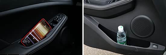 新车前排储物空间还算丰富,不仅数量多,而且容积也都比较大。杯架不带限位器略有些遗憾,不过好在标准大小的水瓶放置起来还算稳妥。