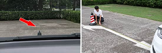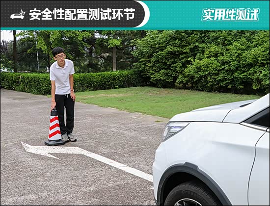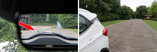 在测试前方视野阶段,我们采用高70cm的桩桶作为参照物,随后调整车距,直至在主驾驶位可以看到桩桶上沿。经过测试,桩桶与车头最终测得的数据为347cm,在测试过的同级别车型中处于中下游水平。