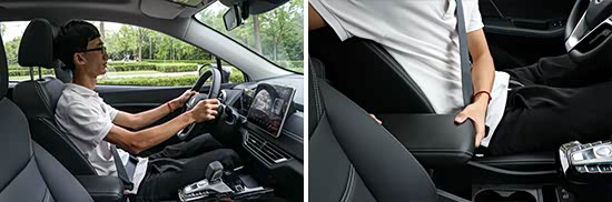 前排配备了中央扶手,支持上下角度调节。不过扶手箱面积较小,而且位置相对靠后,所以即便是抬到最高位置,在正常驾驶坐姿下扶手箱也不能对驾驶员手肘提供有效支撑。