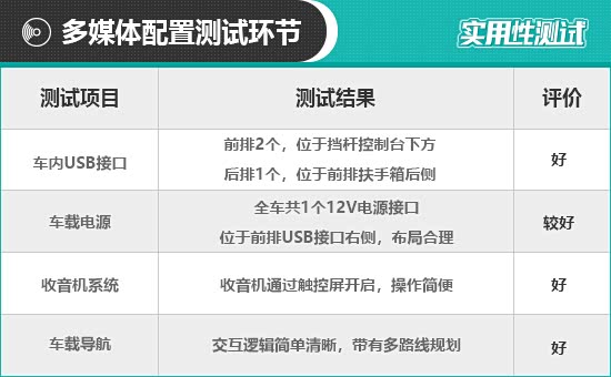 2019款比亚迪元EV535全车共有三个USB接口,布局为前排两个后排一个。我们对每个USB接口的电压与电流进行了测试。其中,前排USB接口电压为5.1V,电流为0.88A;后排USB接口电压为5.1V,电流为0.43A。实测用前排USB接口给手机充电,效率相对会更高一些。此外,车内还提供了1个12V电源接口,位于前排USB接口右侧。