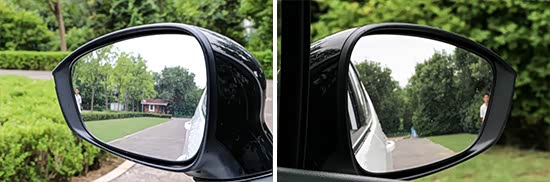 外后视镜视野范围测试时,首先让测试人员分别站在左右后视镜垂直10m处,随即开始向左右两侧移动,直至出现在两侧后视镜最外侧边缘为止,测出其横向距离。随后通过公式计算,便可以得出后视镜视野范围的夹角角度。角度越大则后视镜视野盲区范围越小,反之则后视镜视野盲区越大。
