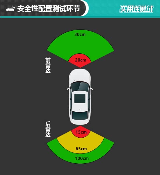 前雷达分为2段,最远的探测距离为30cm。前雷达持续蜂鸣提示距离为20cm,相比设定的标准值略小。值得注意的是,新车前端仅有两侧装配了雷达,所以其主要针对的是两侧45°的障碍物,在停车或是转弯时发挥作用。经实测,车前正面的障碍物雷达无法探测到。