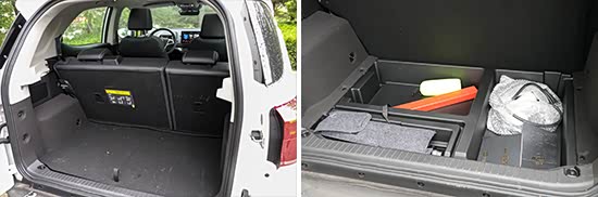 后备箱采用侧开门设计,而且由于是外挂备胎,所以后备箱的内部空间得到了充分的利用,地板下方也设计有储物槽,容积较大相当实用。第二排座椅支持比例放倒,先将坐垫前推,然后放下靠背,最终得到近乎纯平的储物空间。比较遗憾的是作为一台SUV车型,其后备箱内并未设计锚点,实用性略有欠缺。