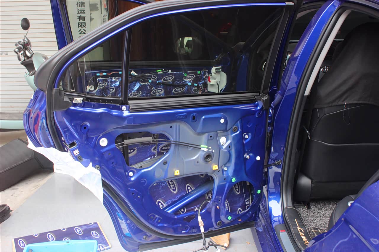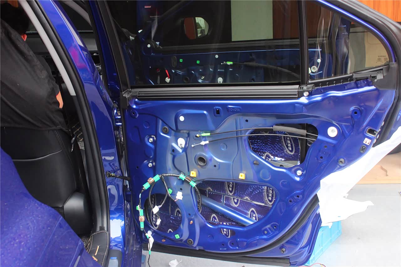先做四门内层大能蓝金刚隔音,这个部位的隔音能有效阻止门板与外层钢板之间振动引起的共振噪声,也让钢板变得更加厚实