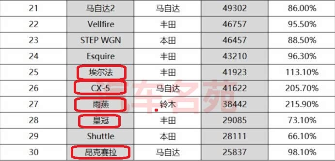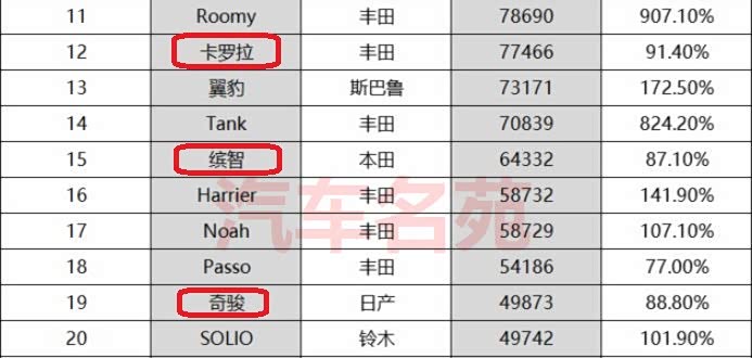 上榜的30款车型当中,在我们国内常见的车型有13款,有3款车型的名称和国内车型不同,剩余10款车型的名称和国内的车型相同:与国内车型不同名的有,排名第2的Note(国内叫骊威),排名第8的丰田雅力士(国内叫致炫、致享),排名第10的日产Serena(国内叫郑州日产御轩)。而与国内车型名称一致的有丰田CH-R、本田飞度、丰田卡罗拉、本田缤智、日产奇骏、丰田埃尔法、马自达CX-5、铃木雨燕、丰田皇冠和马自达昂克赛拉。