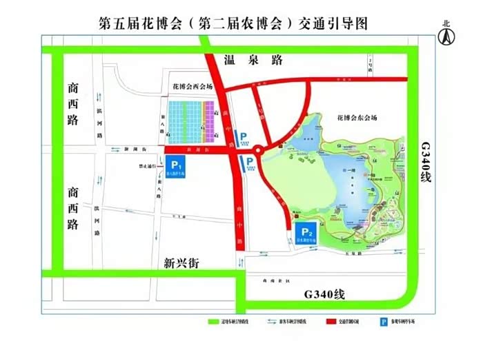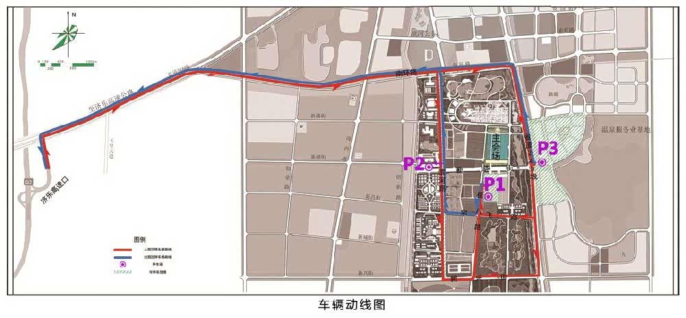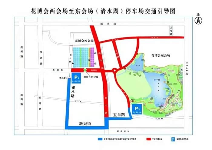 设置停车场两处:1号停车场为崔八路停车场(花博会主场馆)、2号停车场为清水湖停车场(北纬37度清水湖公园)。