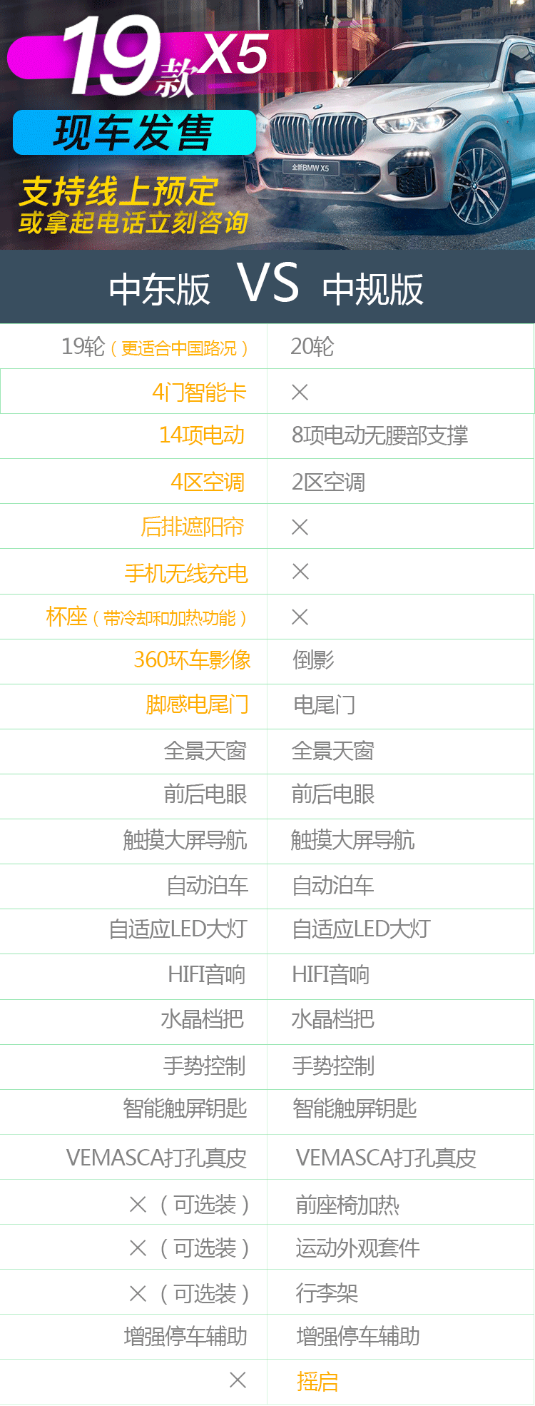 比如在19款宝马x5刚刚上市的时候,很多人都曾打算买一台。不过情况与现在不同,新车火爆,去4S店要80.99万元加价提车,甚至还要提前预定。如果能早些告诉你,这完全可以避免,因为我们在那时的宝马x5只售72万,而且是现车。这个价格有绝对的优势,以至于第一批货一星期内几乎卖光,并且我们在车型配置上做了详细对比,两款车型配置各有千秋,甚至更好。