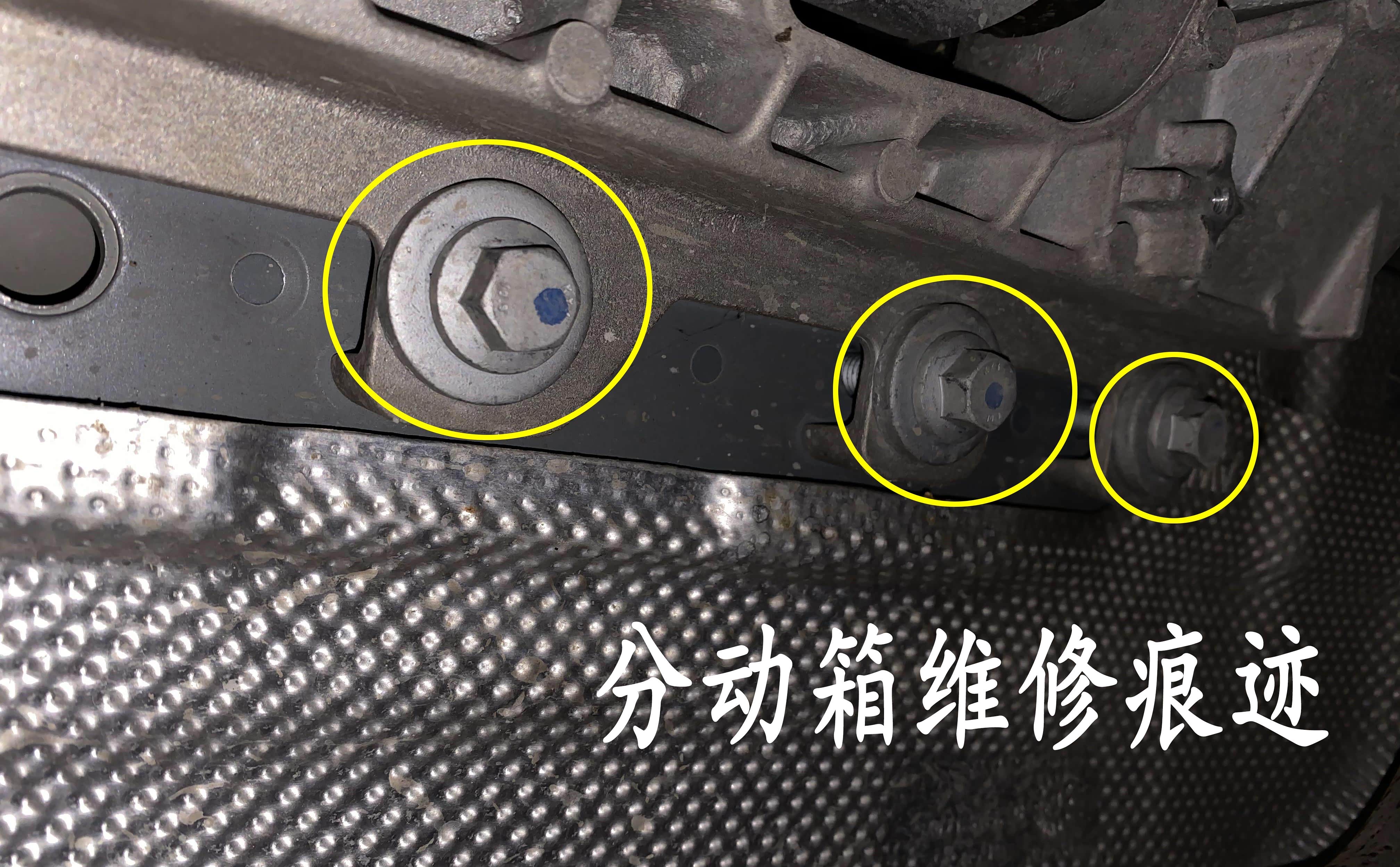 看这里,分动箱的几颗螺丝均有拧动的痕迹,没有人会无缘无故的去拧这几颗螺丝,更何况这还是在底盘下部,因此可判断该车的分动箱是有维修痕迹的,还记得刚刚0BD显示的故障码吗?二者刚好对上了。
