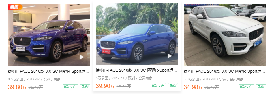2018款 捷豹F-PACE(参数|询价) 3.0 SC 四驱R-Sport运动版,17年出厂,17年底上牌,表显跑了3万公里,目前在二手车市场同款车型的报价基本在35~40不等。