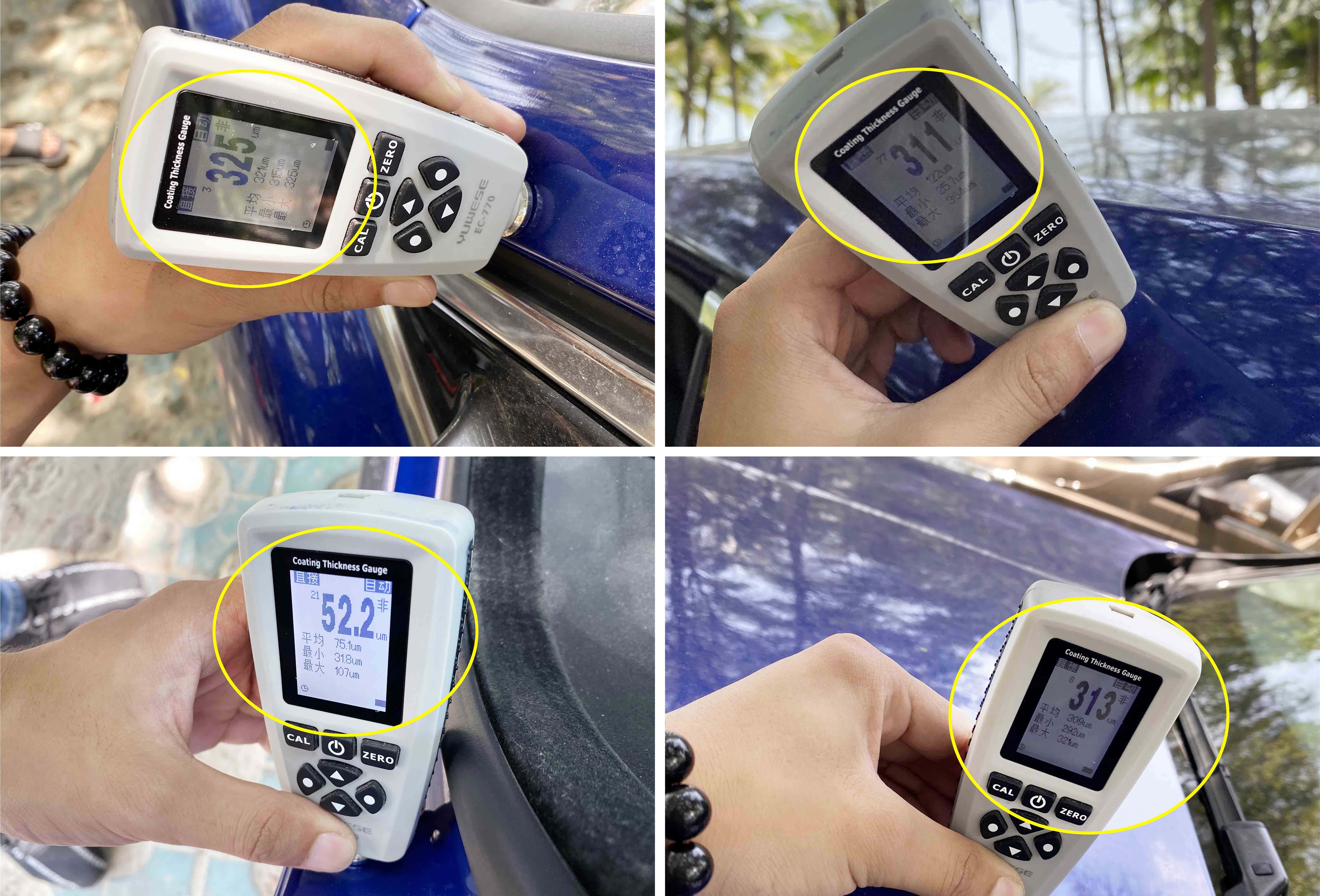 因为车子贴有隐形车衣,所以简单绕车一周之后便取出漆膜仪开始进行漆面检测,整体检测完毕之后发现车辆前保险杠和左前翼子板有漆面修复的痕迹。