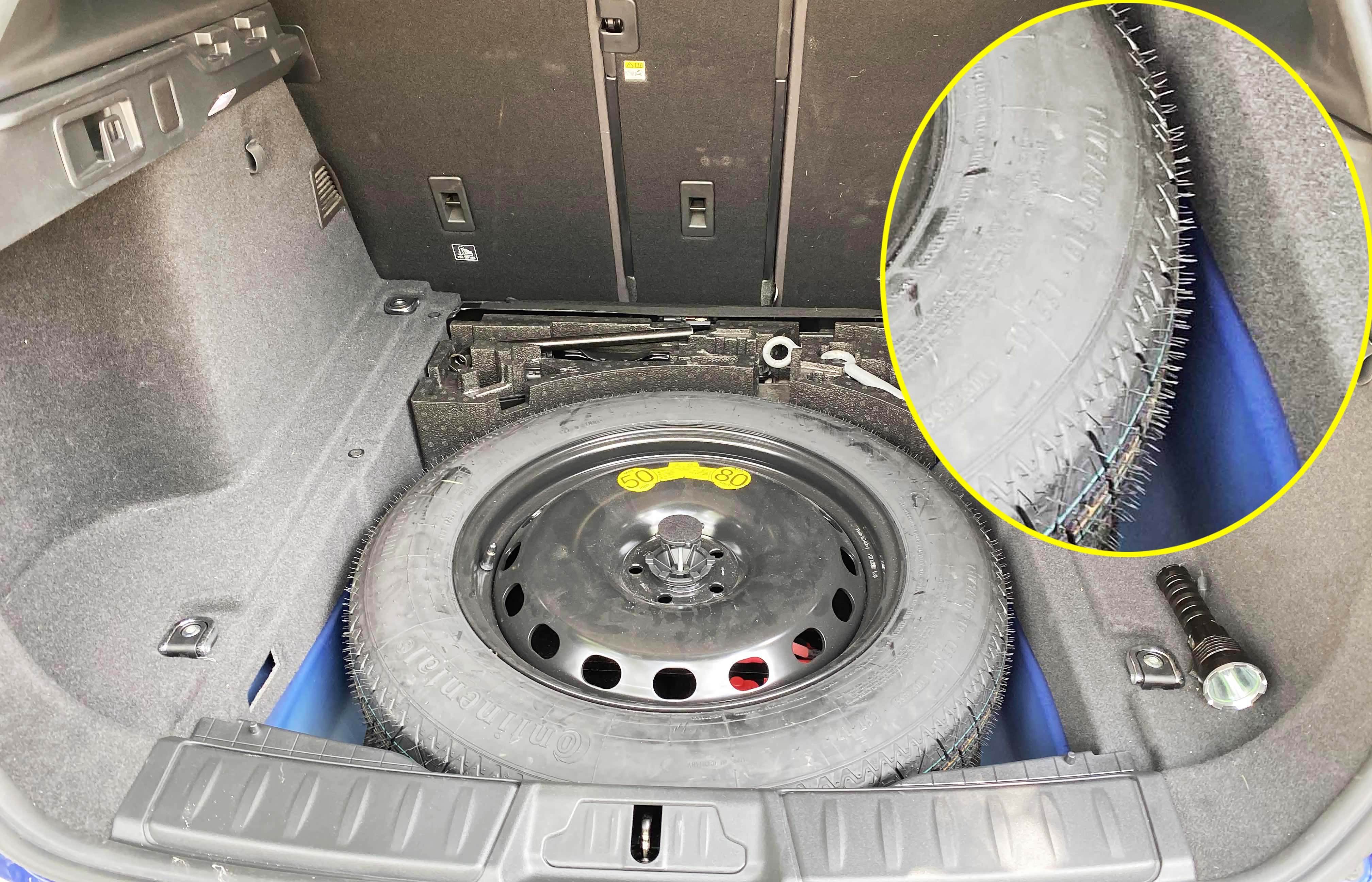 拉开底板,看到了内部的备胎,大家是不是感觉这个备胎看着有些乌突突的,像是下过地?其实不然,大家仔细看,这备胎上的胎毛比逸哥的腿毛都要茂盛,所以肯定没下过地。