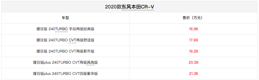 2020款本田CR-V正式宣布上市,本次上市的新车为年度改款车型,主要针对配置进行了调整,售价区间没有变化,依然为16.98-21.38万元。