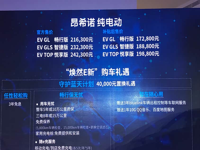 内饰部分,昂希诺纯电动采用的专属7英寸TFT LCD全彩仪表盘为全液晶数码显示,除常规行车数据外,EV专属行车数据、驾驶模式选择、能耗显示等功能一应俱全。中控区域,基于电动车工作特点,昂希诺纯电动去除传统换挡杆设计,改为SBW电子换挡。配备的10.25英寸全触控AVNT,集成了智能网联2.0、BlueLink等智能操作系统,为行车提供充分的便利保证。在操作界面中,配备有EV专属页面,可查看EV系统核心信息、碳排放减少等数据。