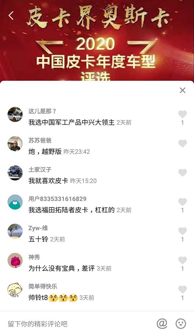 近年来随着皮卡产品消费结构升级,皮卡车已不再局限于用作工具车,其一车多用的属性正在逐步显现。本次评选活动,主办方同时面向全网开启投票征集,请大家选出自己希望进行评测的车型,短短几天以来,投票活动得到了全国各地的卡友们积极响应,据目前不完全统计,参加投票人数已达万余人。从投票结果上看,不少主流皮卡企业的拳头产品都有不少拥趸,其中上月底刚刚上市的长安凯程F70更是高达三千多票。除此以外,还有很多网友在中国皮卡网微信公众号、头条号、抖音等平台纷纷留言,希望能看到自己心仪的评测车型出场。