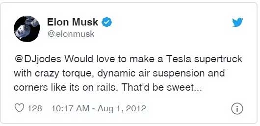 互联网有记忆。2012 年 8 月 1 日,特斯拉正深陷 Model S 产能地狱,Elon 第一次对外透露了打造特斯拉超级皮卡的想法。