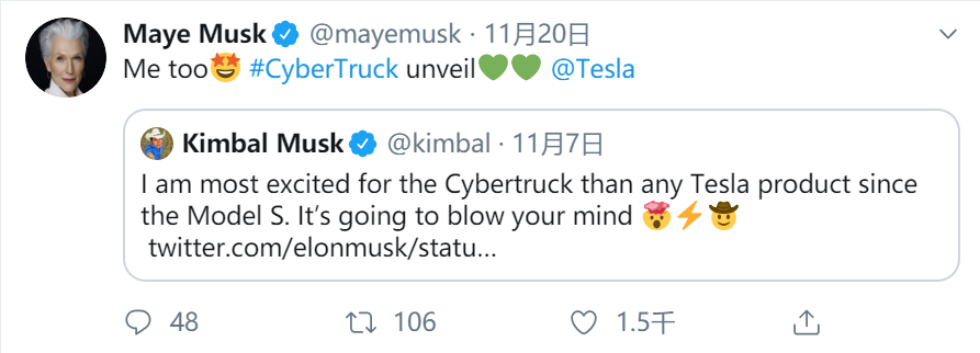 就在特斯拉公布发布会日期后,特斯拉独立董事、Elon 的弟弟 Kimbal Musk 表示,特斯拉 Cybertruck 是特斯拉自 Model S 以来最让他感到激动人心的产品,Ta 一定会让你瞠目结舌。Elon 妈妈 Maye Musk 转发说,俺也是:)