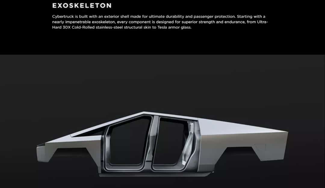 看了特斯拉官网对 Cybertruck 车身及车窗的介绍,我们会对这款产品有更深的认识。「几乎坚不可摧,这是我们能找到的最好的材料」。按照 Elon 的说法,Cybertruck 车身可防 9mm 子弹。特斯拉表示, Cybertruck 的车身是由 ULTRA-HARD 30X 冷轧不锈钢制成的。