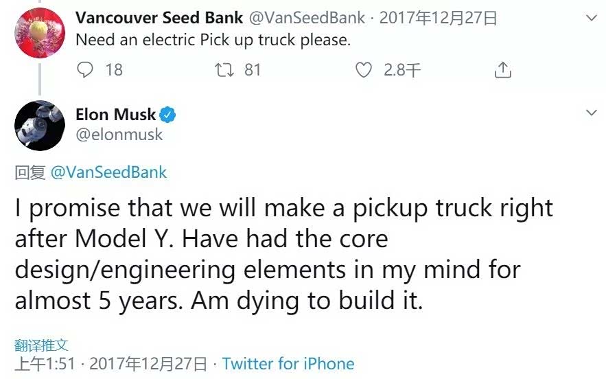 2017 年 12 月 27 日,Elon 在回复网友时透露,关于特斯拉皮卡的核心设计和工程化元素已经在他心中打磨了五年,他迫不及待想要打造一款皮卡。