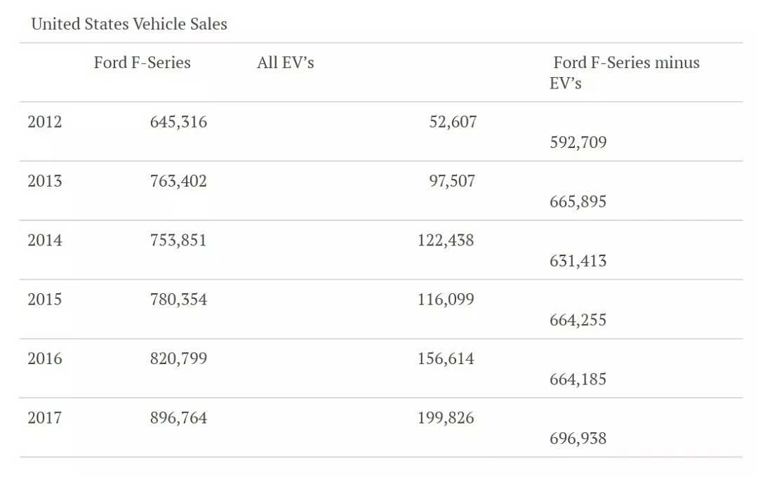 事实上,自 1977 年以来,福特 F 系列皮卡已经连续 42 年卫冕美国最畅销车型。2018 年销量更是达到了史无前例的 90 万辆,是特斯拉全系车型全球年销量的 3 倍以上。