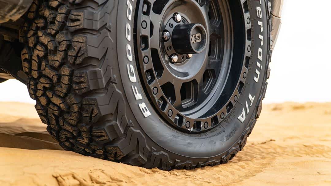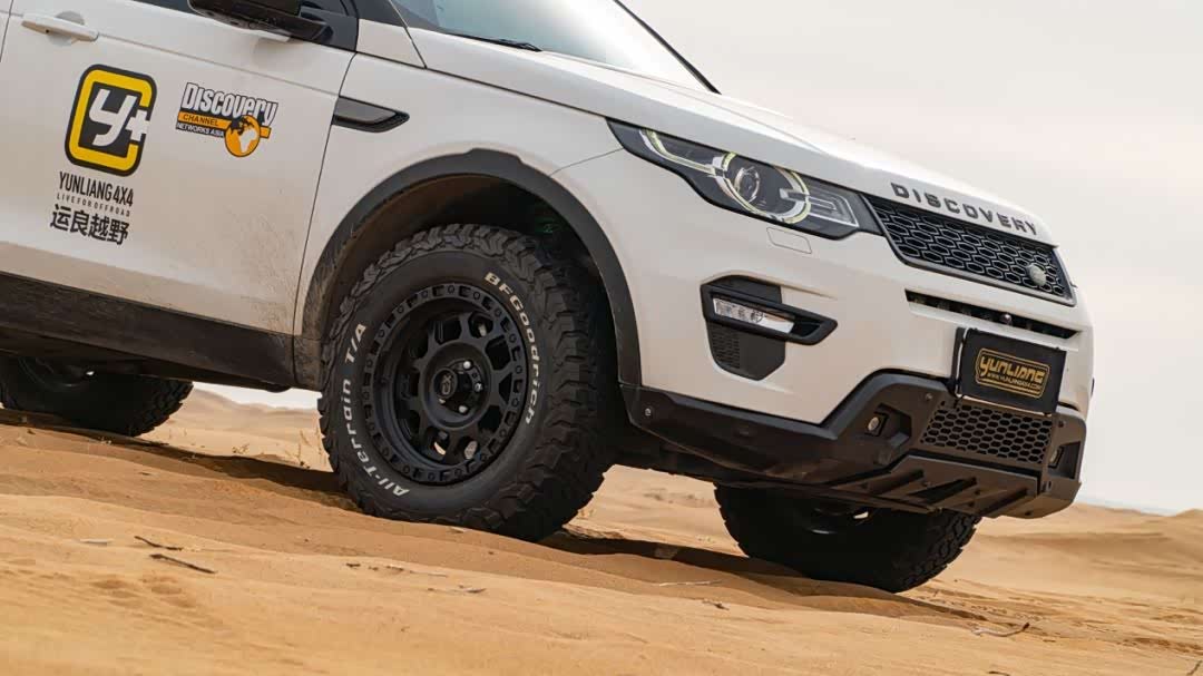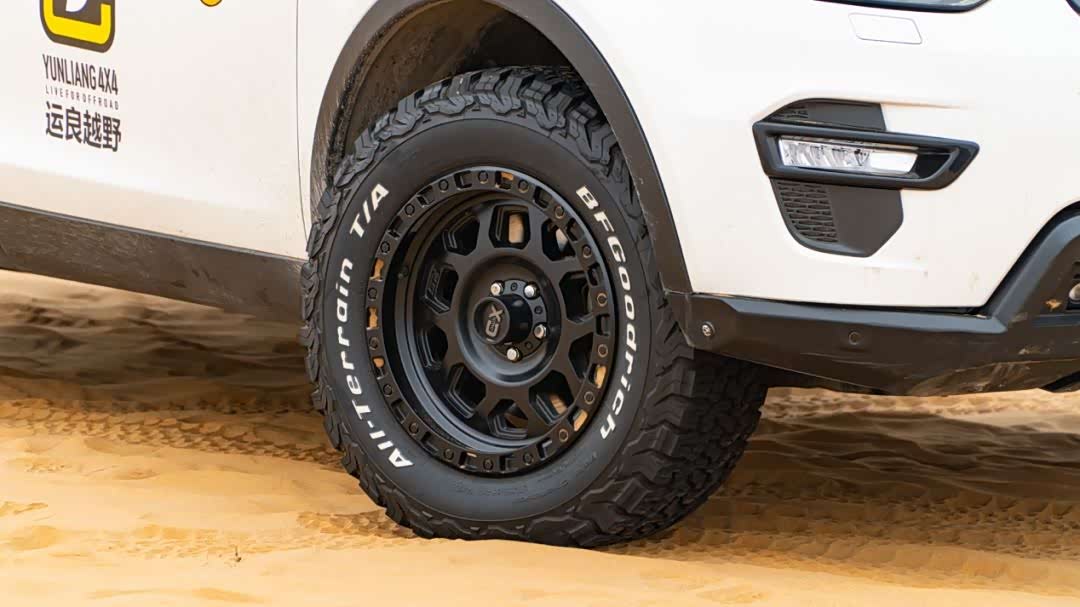 这台发现神行更换了XD负值轮毂,搭配255/65/R17的百路驰KO2轮胎,得益于较原厂更大的扁平比与更宽的胎面,在降低胎压后,行驶在绵软的沙地上也能保证有足够的牵引力。