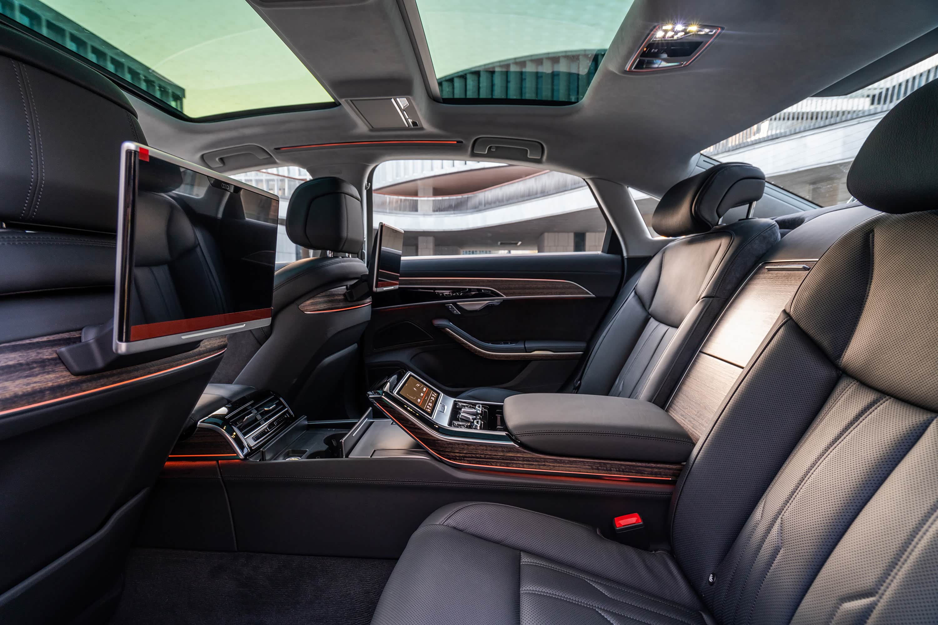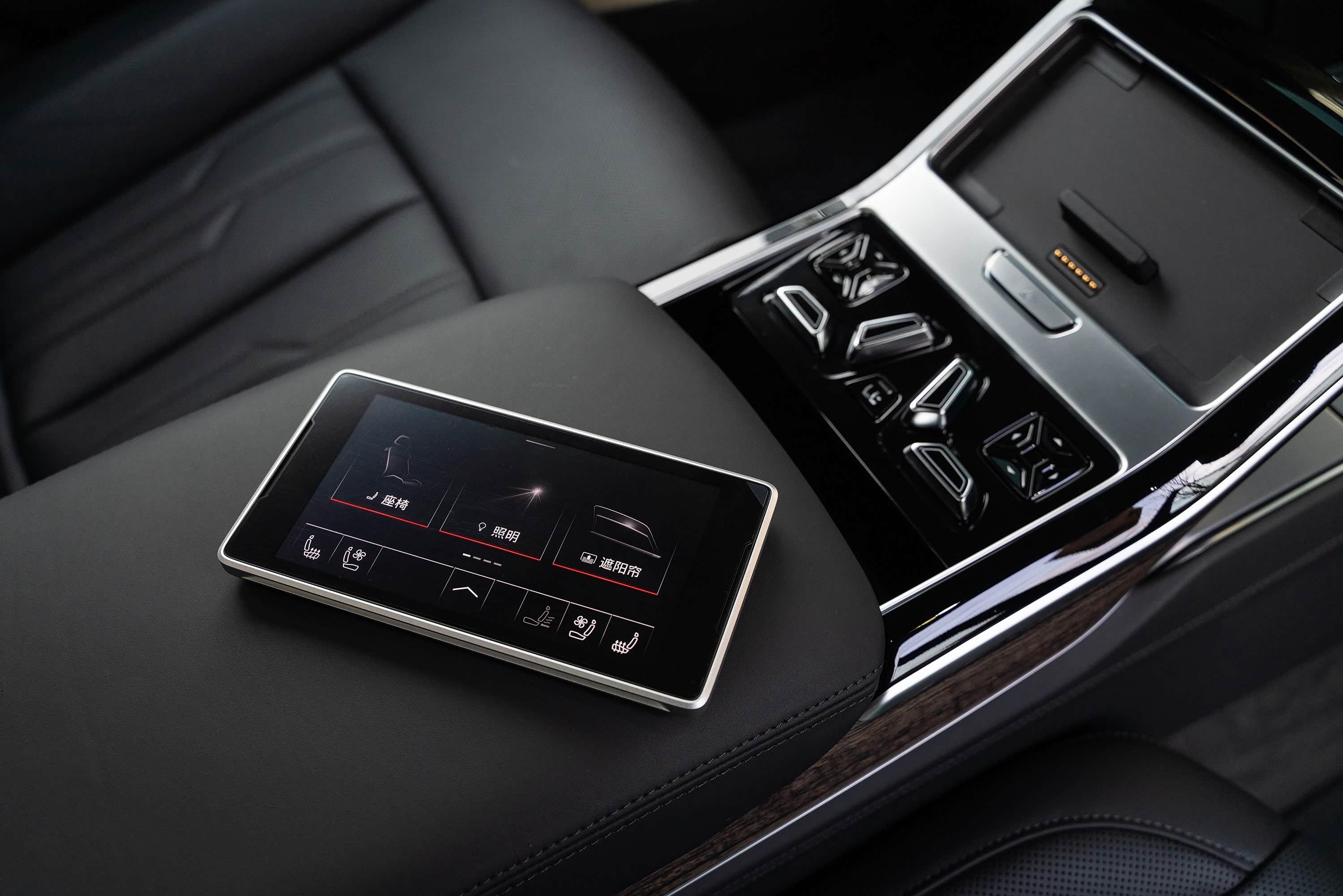 除了前排的三块大屏之外,在后排乘客面前同样也有三块大屏,外加驾驶者眼前的抬头显示,总共七块液晶显示屏让A8L拥有同级别车型中最多的显示屏,大型豪华轿车的科技感被提升到了新的高度。后排的三块大屏包括两块10英寸的基于安卓系统的平板电脑和一块位于中央扶手上的5.7英寸控制器,通过这个控制器后排乘客能够实现对座椅、灯光、空调和多媒体等系统的调节。