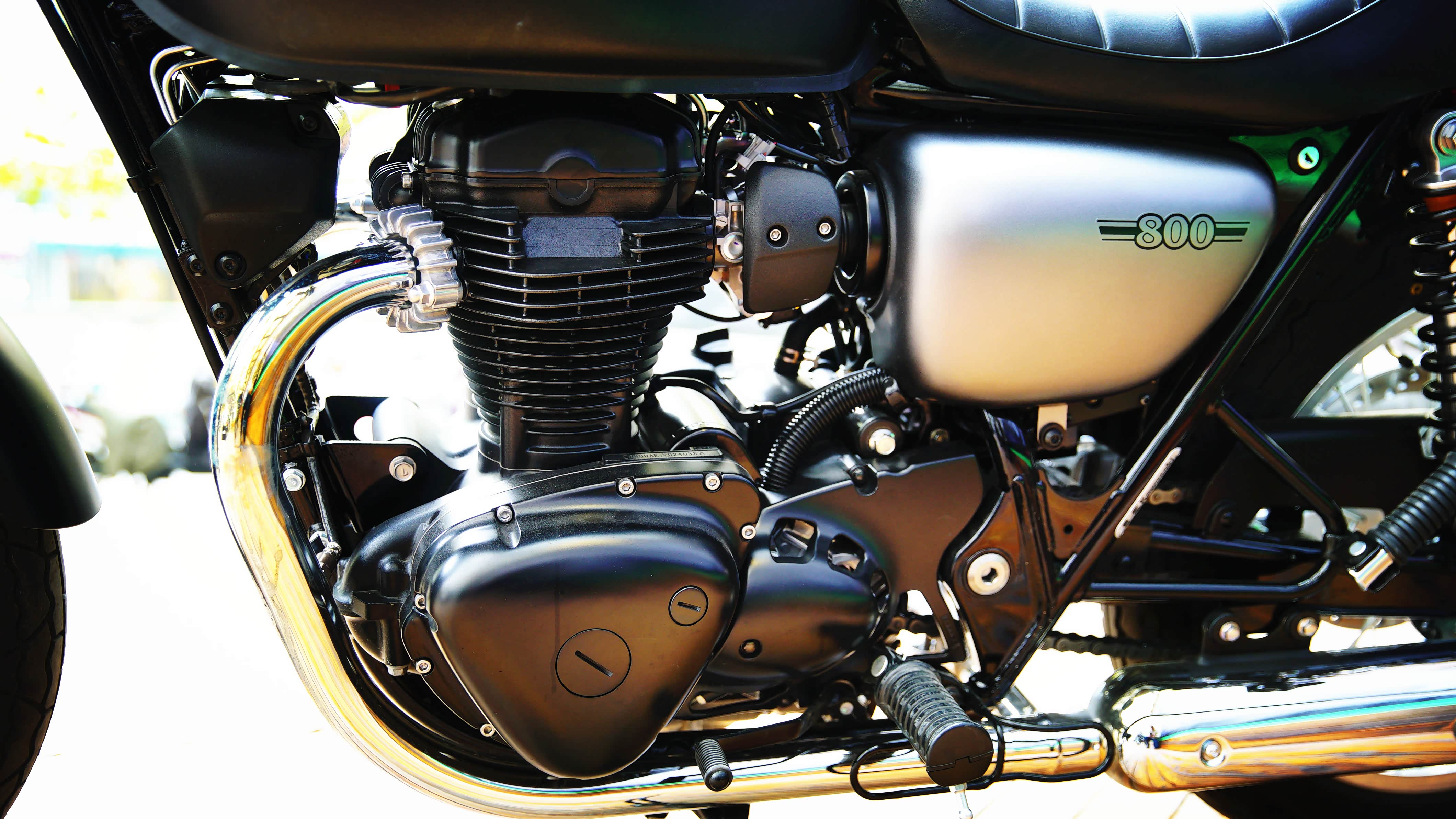 2011年,接班人W800浮出水面。在动力装置上,W800搭载了空冷发动机,充分裸露缸体、曲轴箱以及大型散热片,彰显强调金属质感的古典审美。这台直列双缸的缸体与曲轴箱构成90度直角,简洁明快的设计让人视觉愉悦;高拉力钢管双摇篮式车架,则是这台空冷发动机的绝配,让机械美感呈露无遗。