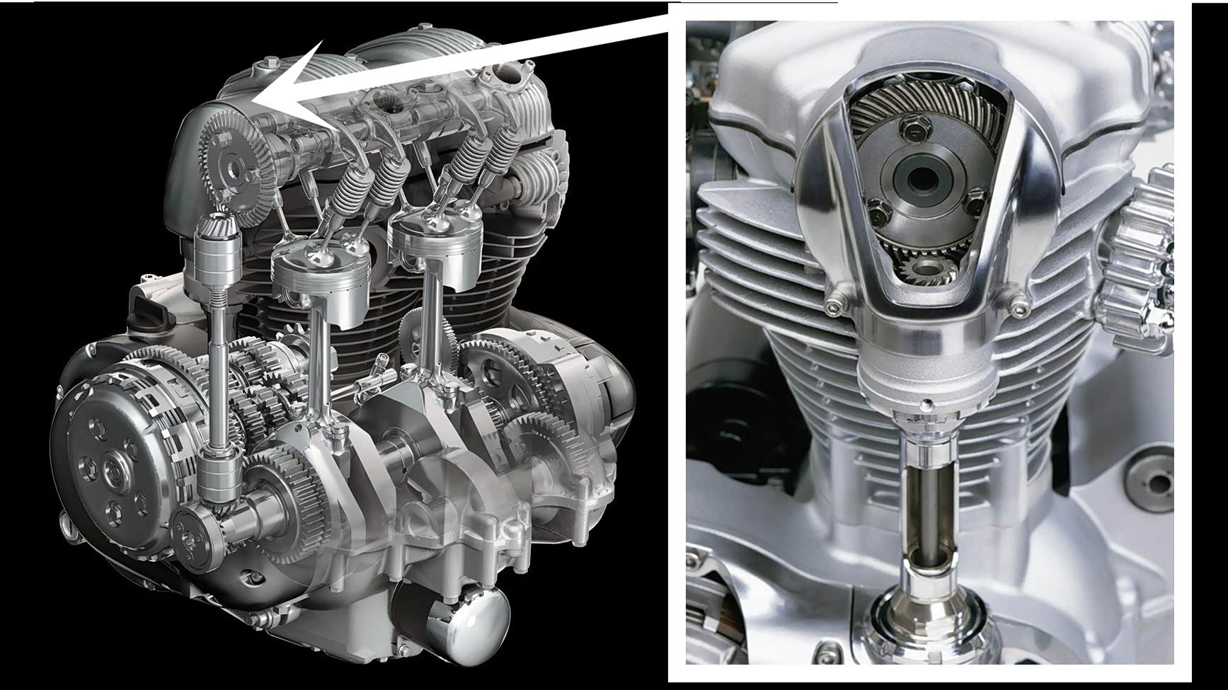 W800 Street气门机构比较独特,采用的是轴和伞齿轮驱动凸轮轴。这种结构显著增加了直列双缸古典韵味,启动后伞齿轮发出的金属质感很强的呜呜声,成为W800 Street独特个性的组成部分。