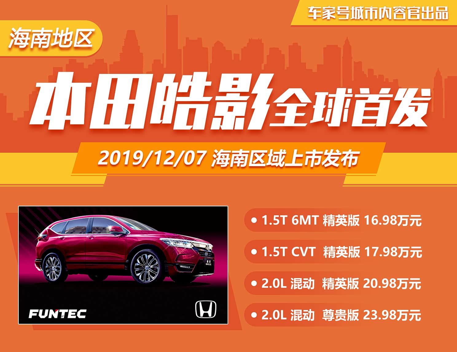本田皓影全球首发16.98-23.98万元起售 海南区域已上市