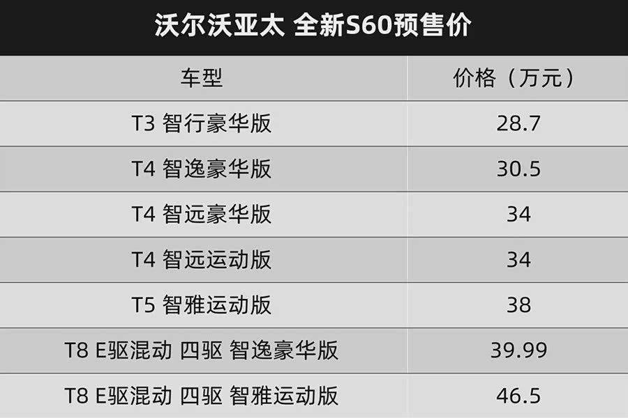 沃尔沃全新S60动力方面,新车将搭载T3、T4、T5三个输出版本的2.0T发动机,传动部分,匹配8速手自一体变速箱,全新S60底盘方面,新车的悬架形式为前双叉臂式独立悬架和后多连杆式独立悬架,T3、T4和T5版本为前驱车型,T8版本还将配备一套四驱系统。(文/汽车之声 qches)