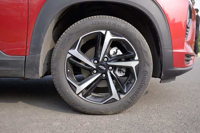 我们驾驶到的这台RS版本的车型配备了225/55/R18的马牌UC6轮胎,从轮胎的配置上看,似乎雪佛兰在这款顶配车型上是想要更强调舒适性的。轮毂方面,RS版本的车型配备了双拼色轮毂,行驶中视觉效果不错。而普通的Redline版本则是配置225/60/R17的玛吉斯轮胎,其轮毂也是纯黑色的,视觉效果相比RS版本就略显逊色了。
