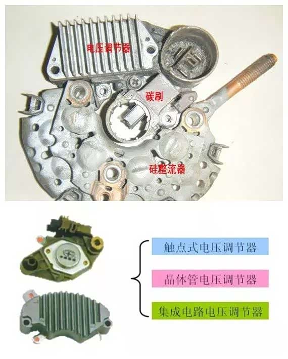 3、电压调节器:电压调节器的作用是用来调节发电机的输出电压,使发电机的输出电压保持在13.8-14.4伏之间。因为发电机的输出电压是随发动机的转速的升高而升高的,如果发动机转速过高,导致发电机输出电压过高,会烧毁汽车的电气系统及一些精密的电子元件。有了电压调节器,就可以避免这些问题。现在汽车上的电压调节器都是电子式的,多数集成在发电机内部,只有少部分是外置式的。绝大多数的发电机故障都是由于电压调节器故障引起的。