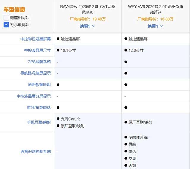 连年的车市寒冬让国内车市掀起没有硝烟的战争,目前已进入了白热化阶段,而紧凑型SUV作为中国车市最受消费者青睐的车型,其市场更是成为各家车企的"必争之地"。放眼望去似乎每一款车型都足够优秀,令人难以抉择。为了让大家选出最适合自己的爱车,小编今天为大家寻来了RAV4荣放(2020款2.0T 两驱风尚版 起售价19.48万)、WEY VV6(2020款2.0T 两驱Collie智行+ 起售价16.80万)对比一番,看看谁才是紧凑级SUV霸主。