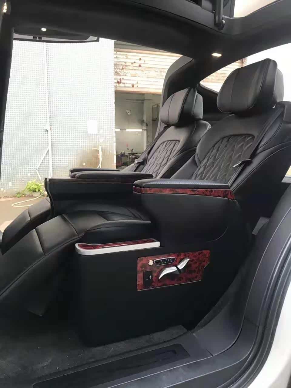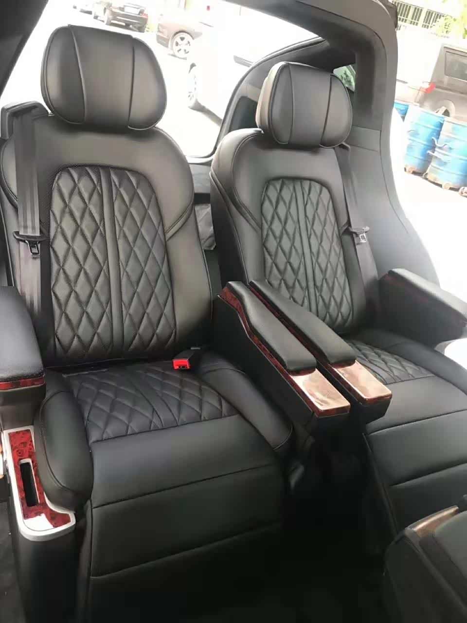 前排简单的主副驾座椅升级包覆,坐垫高度略微提升,增加了坐垫的厚度和靠背厚度,让乘坐更舒适;后排则升级了商务航空座椅,与埃尔法商务车中排座椅一样舒适,采用与原车一样的黑耀色,两侧用桃木饰品点缀。