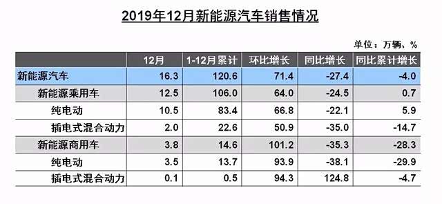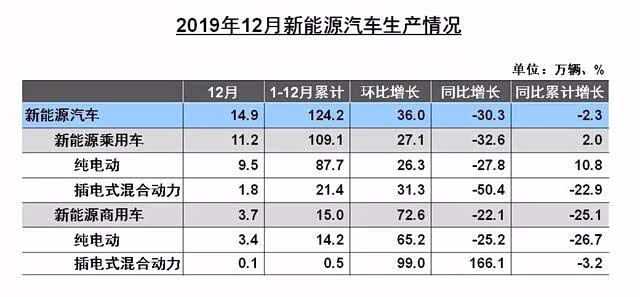 据中汽协数据显示,2019年12月新能源汽车产销分别完成14.9万辆和16.3万辆,与上个月相比分别增长36%和71.4%,同比下降30.3%和27.4%。在新能源汽车主要品类方面,纯电动乘用车、插电式混动乘用车、纯电动商用车销量都呈现出不同程度的下滑。