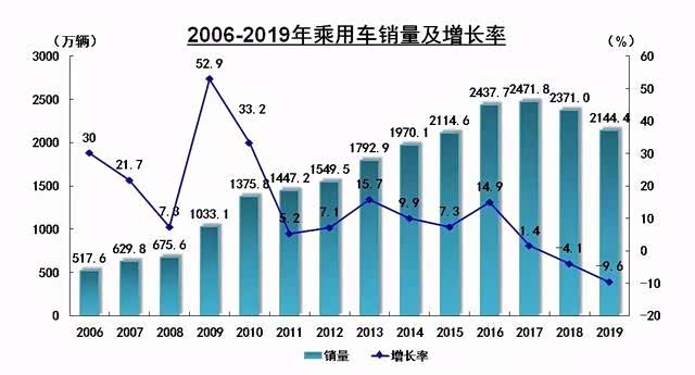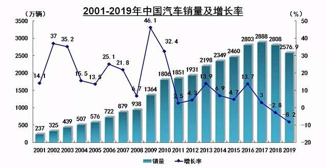 2019年,汽车产销分别完成2572.1万辆和2576.9万辆,产销量同比分别下降7.5%和8.2%,产销量降幅比上年分别扩大4.2和5.4个百分点。产销量继续蝉联全球第一。