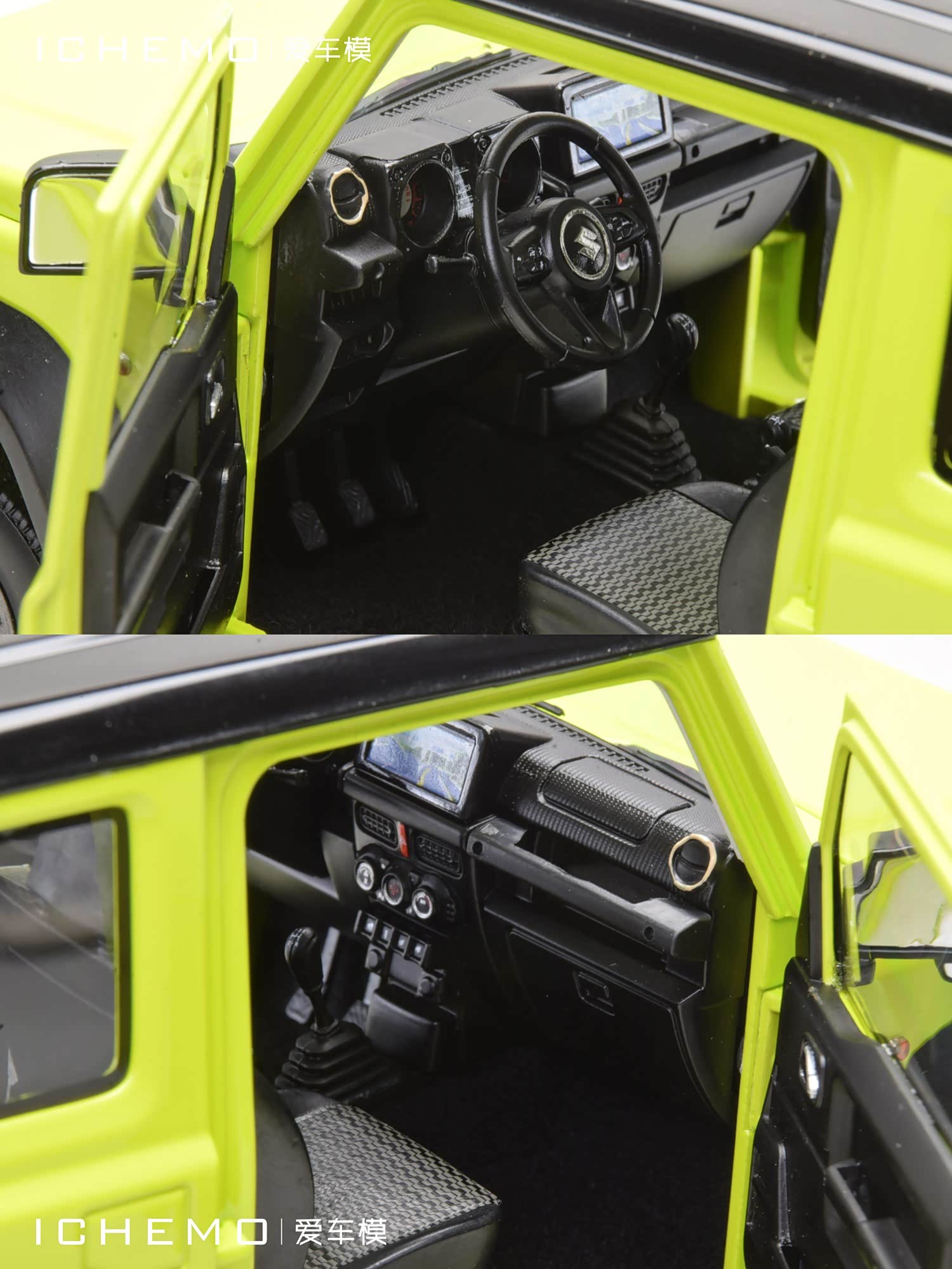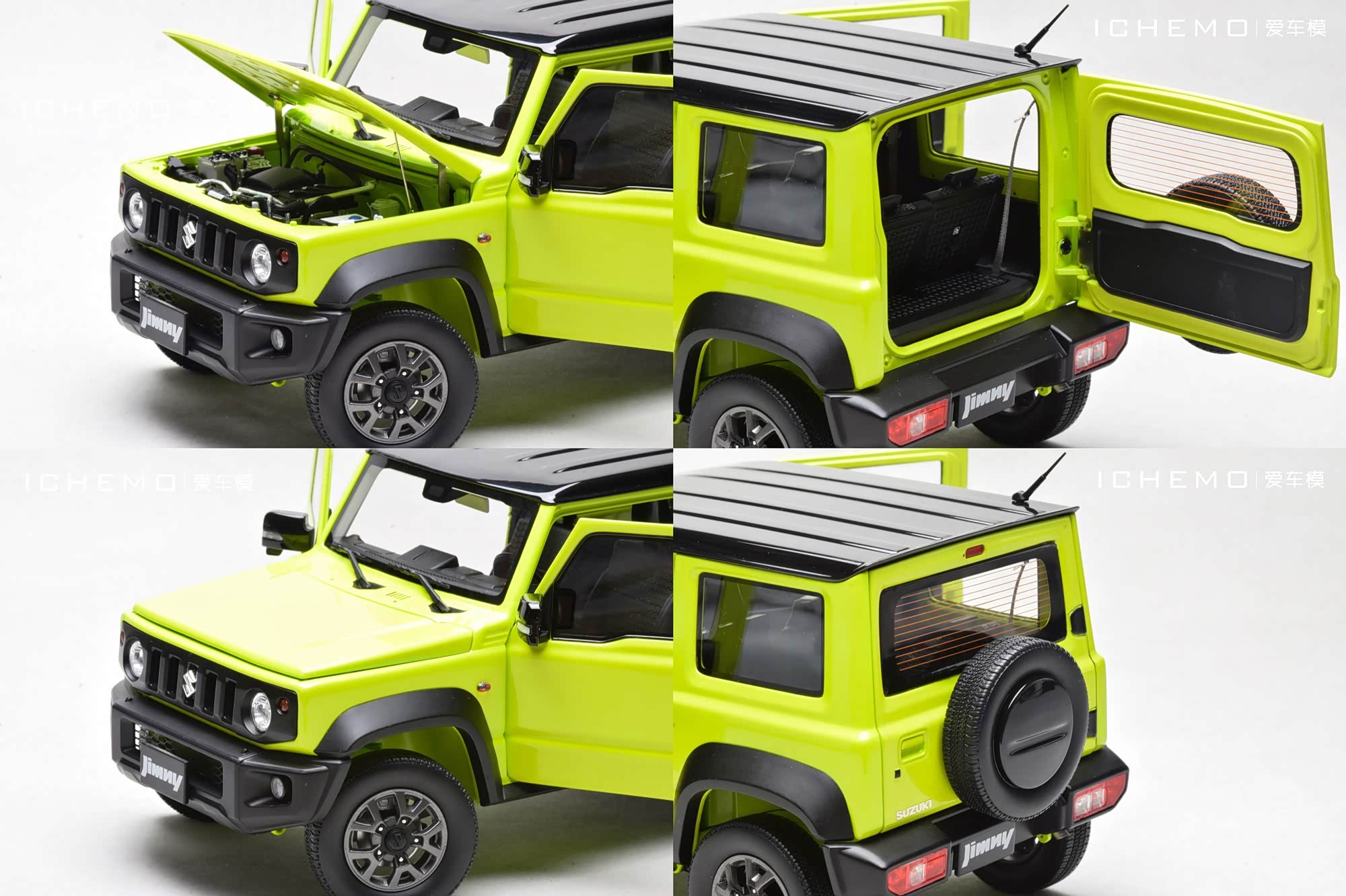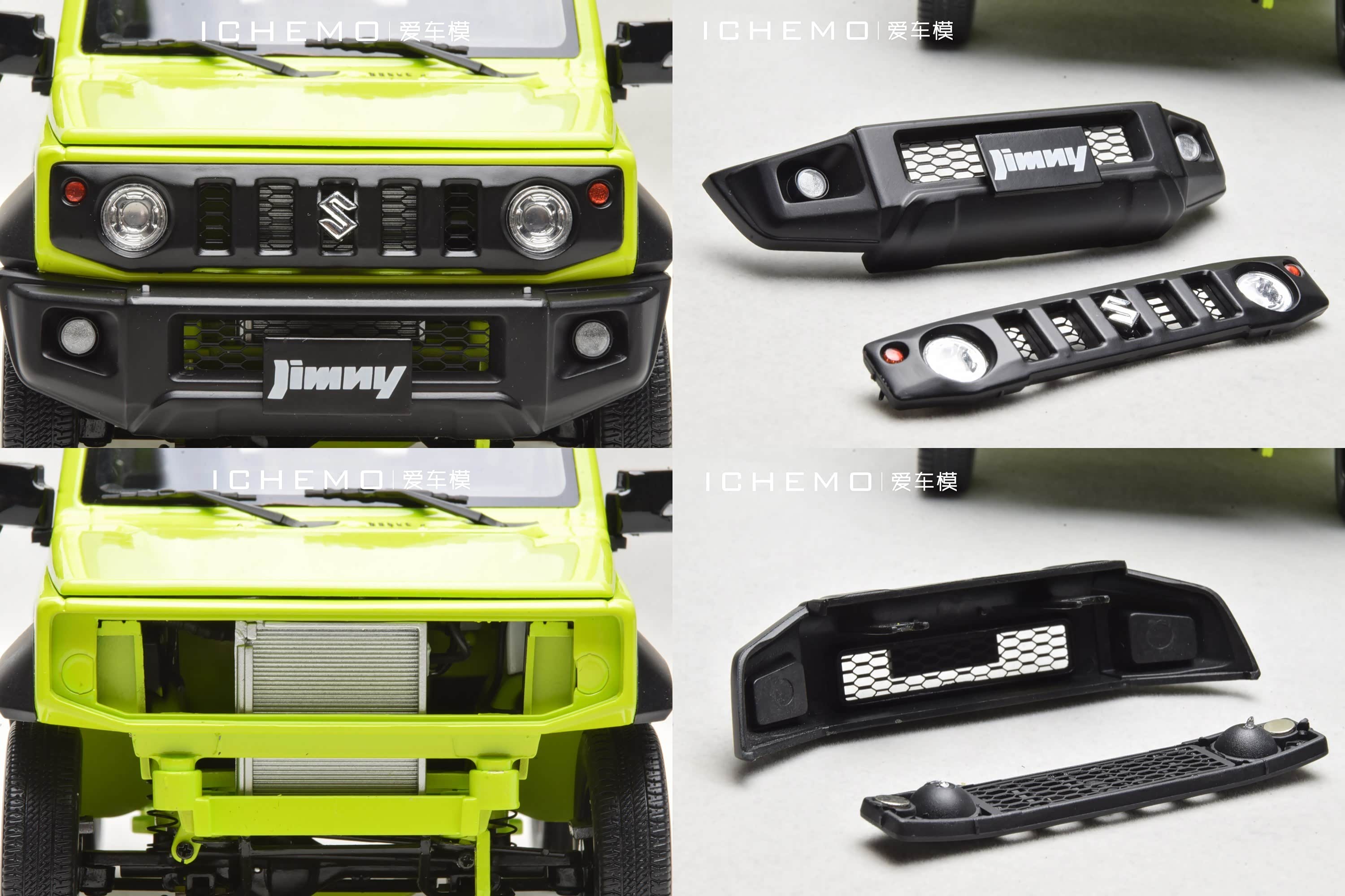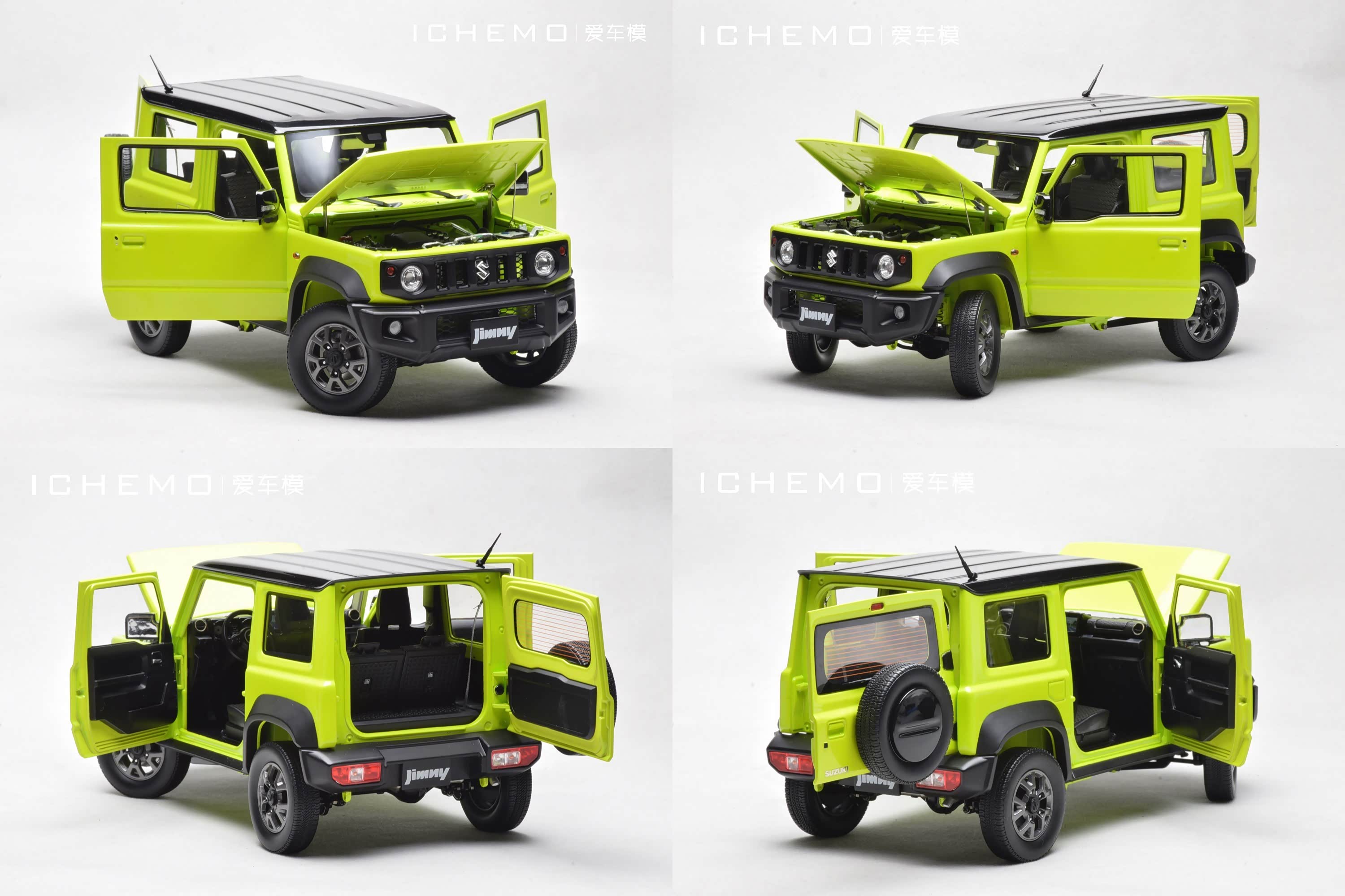 BM Creations 出品 1:18 比例合金全开工艺 Suzuki Jimny Sierra(JB74)汽车模型;模型两侧车门/发动机盖/尾门可打开;模型四轮带“避震”功能,且四轮可拆卸;模型前/后保险杠、前脸中网格栅可拆卸。本文所摄模型实物为量产上市版,模型车身配色为 Kinetic Yellow + Bluish Black Pearl 3 Top 动能黄/珍珠黑车顶(3 门左舵),限量发售 999 台,建议零售价 1280 元/台。