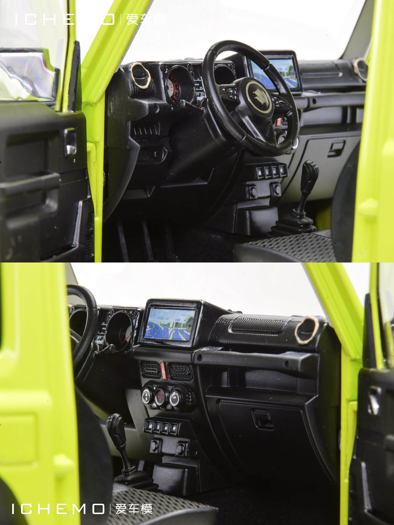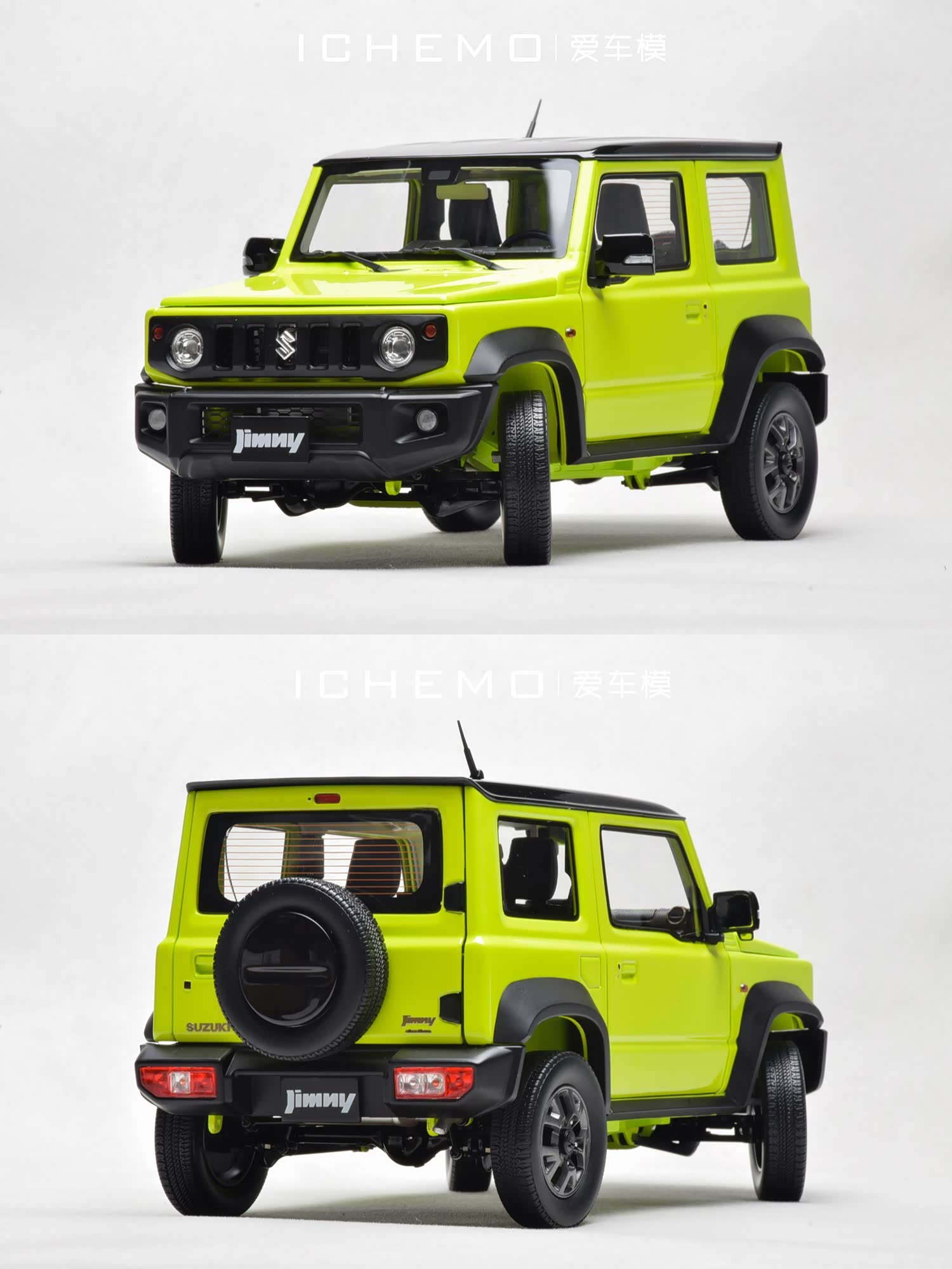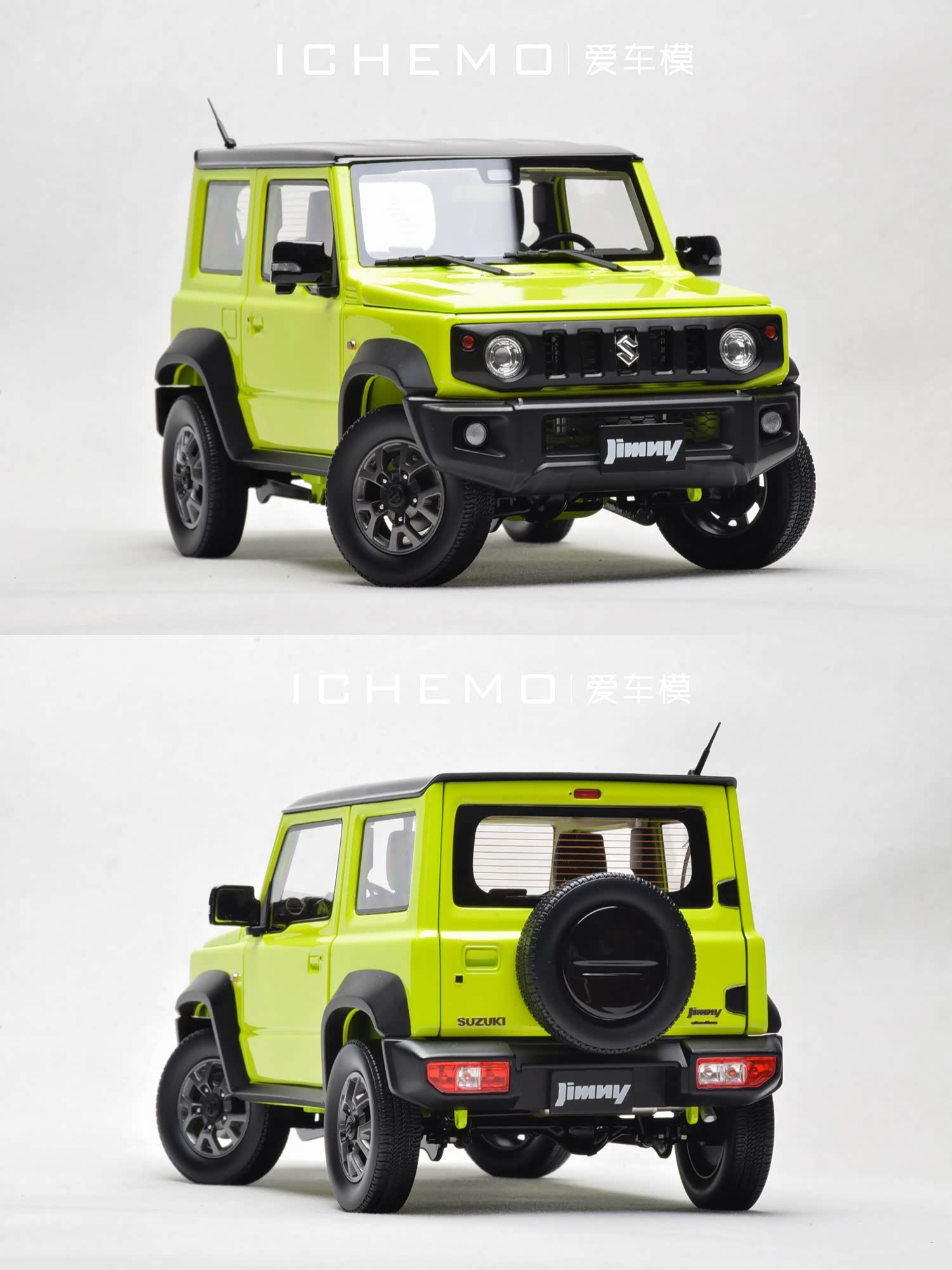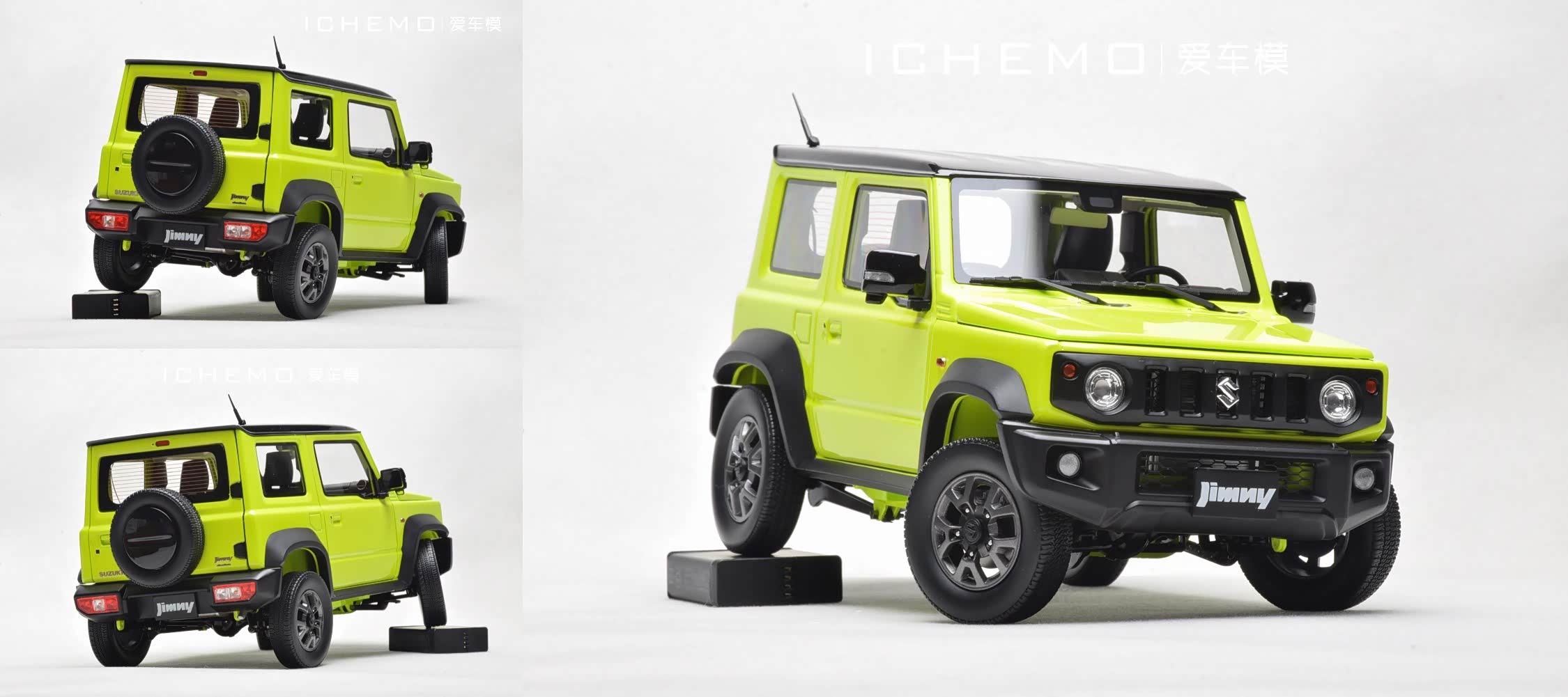 BM Creations 出品 1:18 比例合金全开工艺 Suzuki Jimny Sierra(JB74)汽车模型;模型两侧车门/发动机盖/尾门可打开;模型四轮带“避震”功能,且四轮可拆卸;模型前/后保险杠、前脸中网格栅可拆卸。本文所摄模型实物为量产上市版,模型车身配色为 Kinetic Yellow + Bluish Black Pearl 3 Top 动能黄/珍珠黑车顶(3 门左舵),限量发售 999 台,建议零售价 1280 元/台。