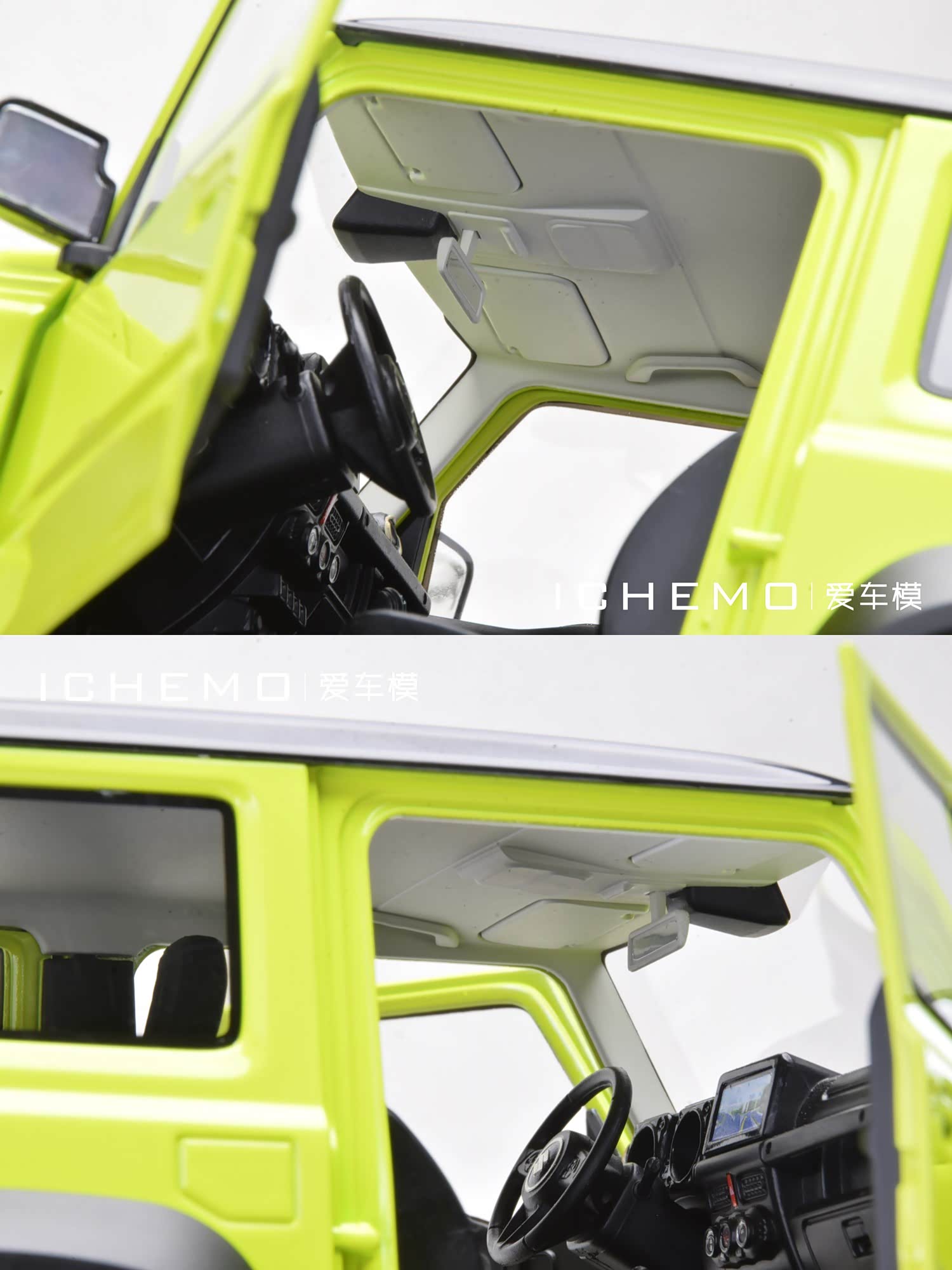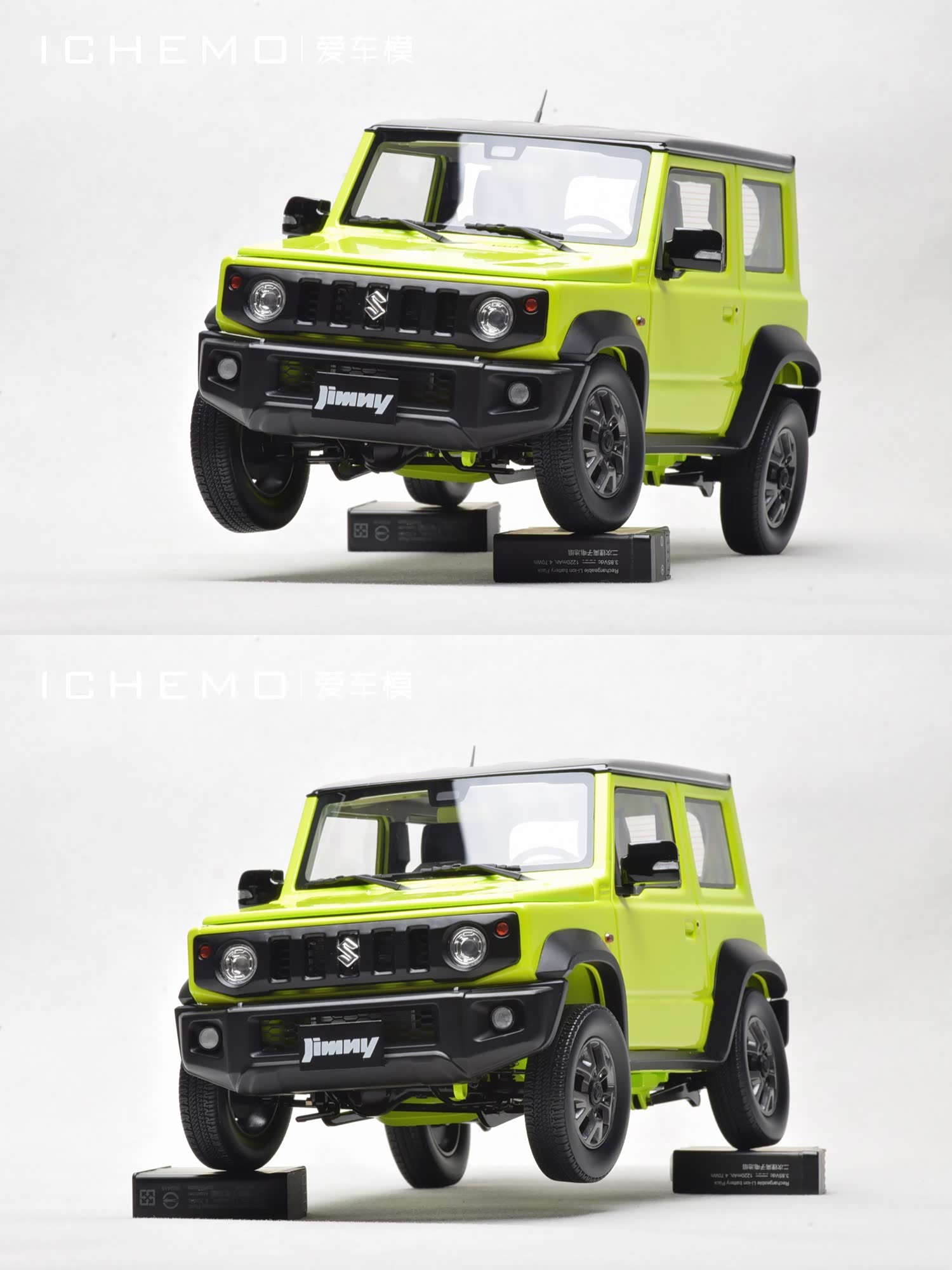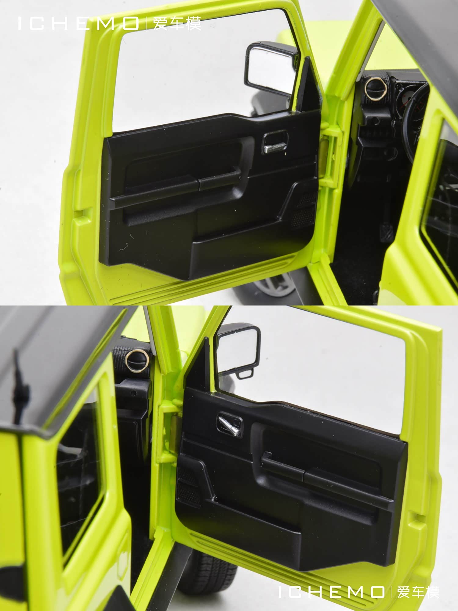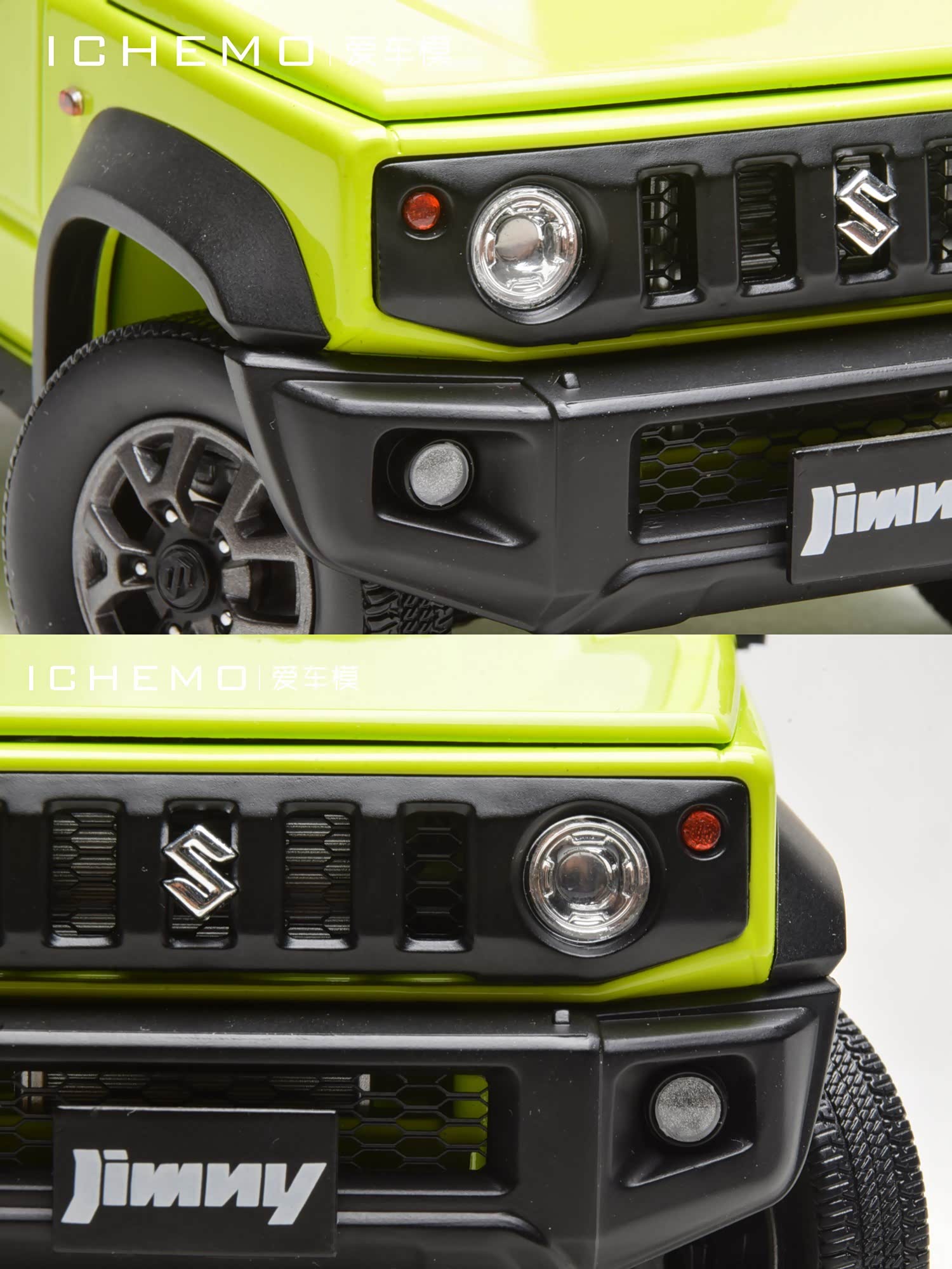 BM Creations 出品 1:18 比例合金全开工艺 Suzuki Jimny Sierra(JB74)汽车模型;模型两侧车门/发动机盖/尾门可打开;模型四轮带“避震”功能,且四轮可拆卸;模型前/后保险杠、前脸中网格栅可拆卸。本文所摄模型实物为量产上市版,模型车身配色为 Kinetic Yellow + Bluish Black Pearl 3 Top 动能黄/珍珠黑车顶(3 门左舵),限量发售 999 台,建议零售价 1280 元/台。