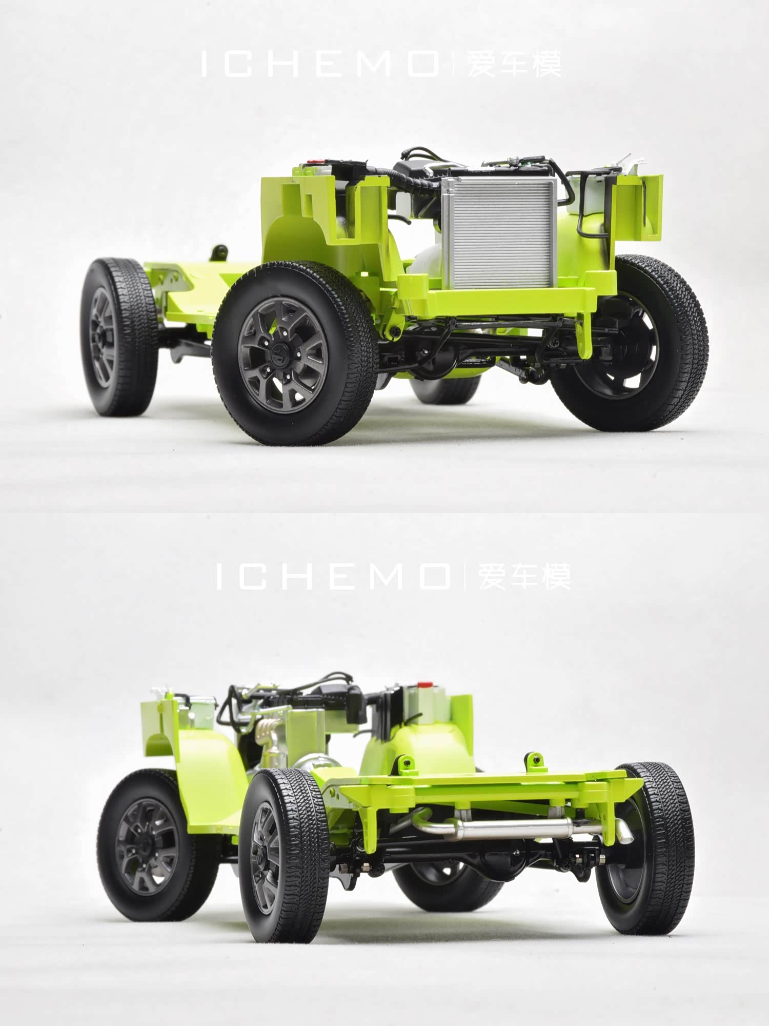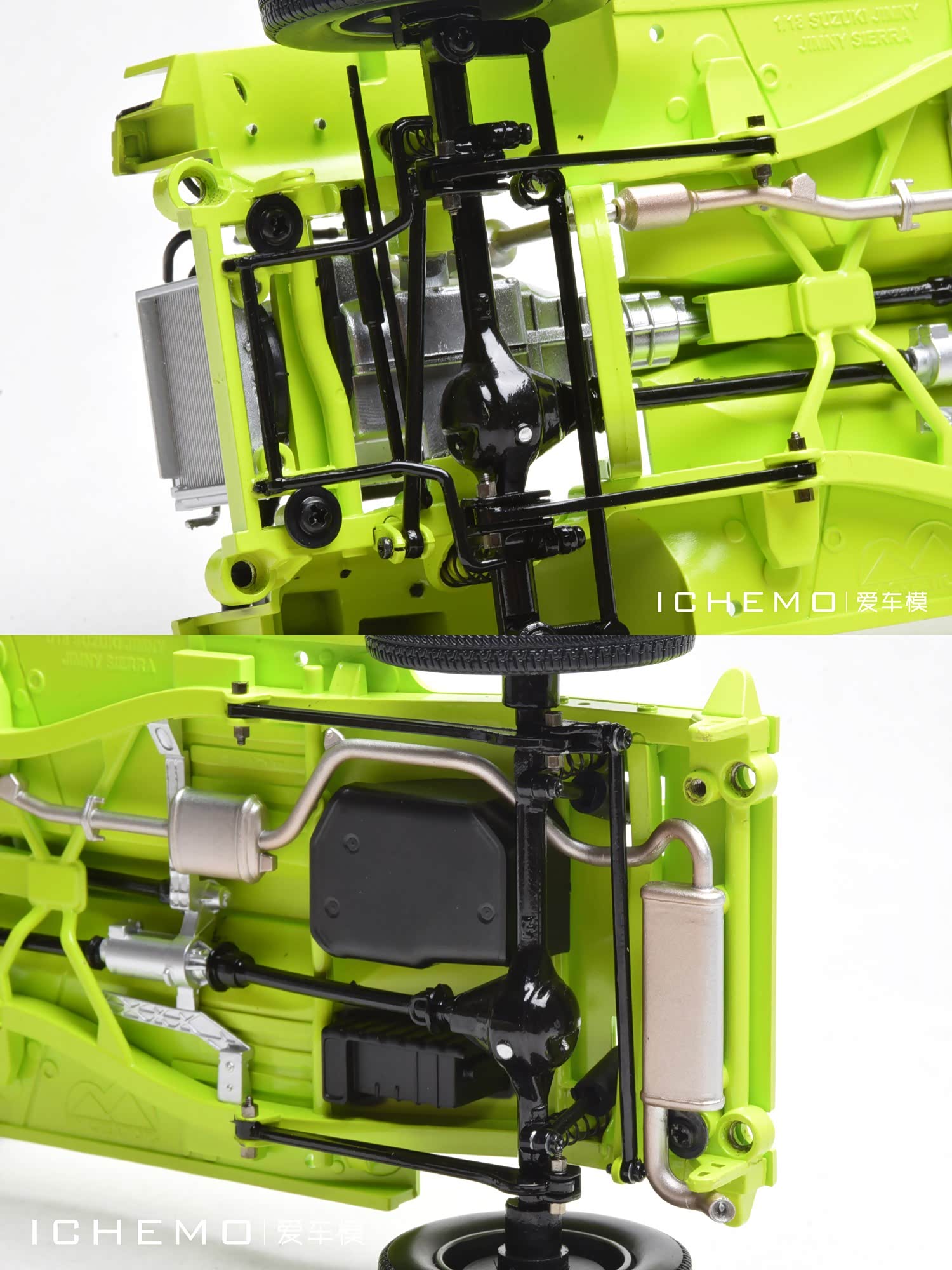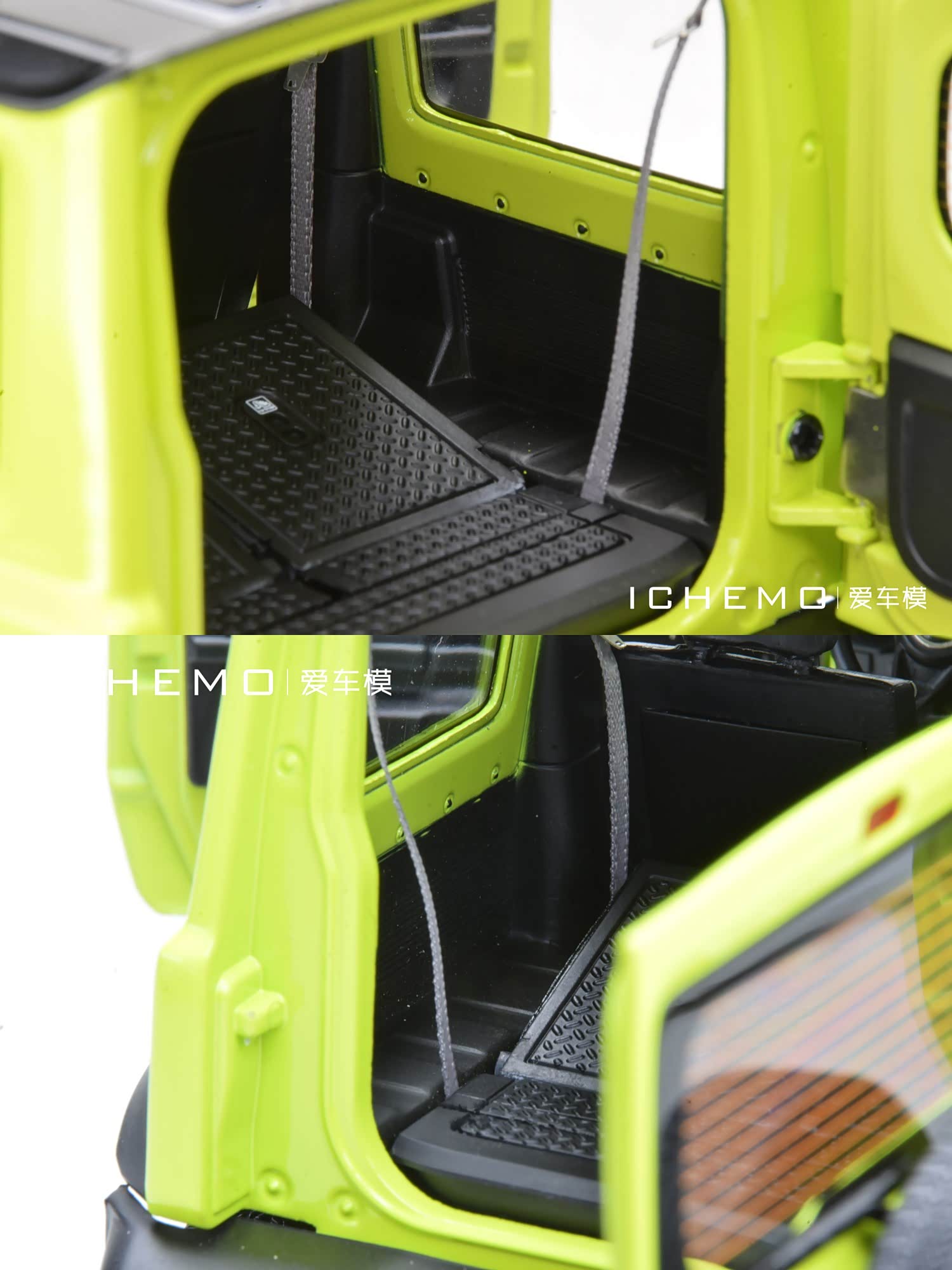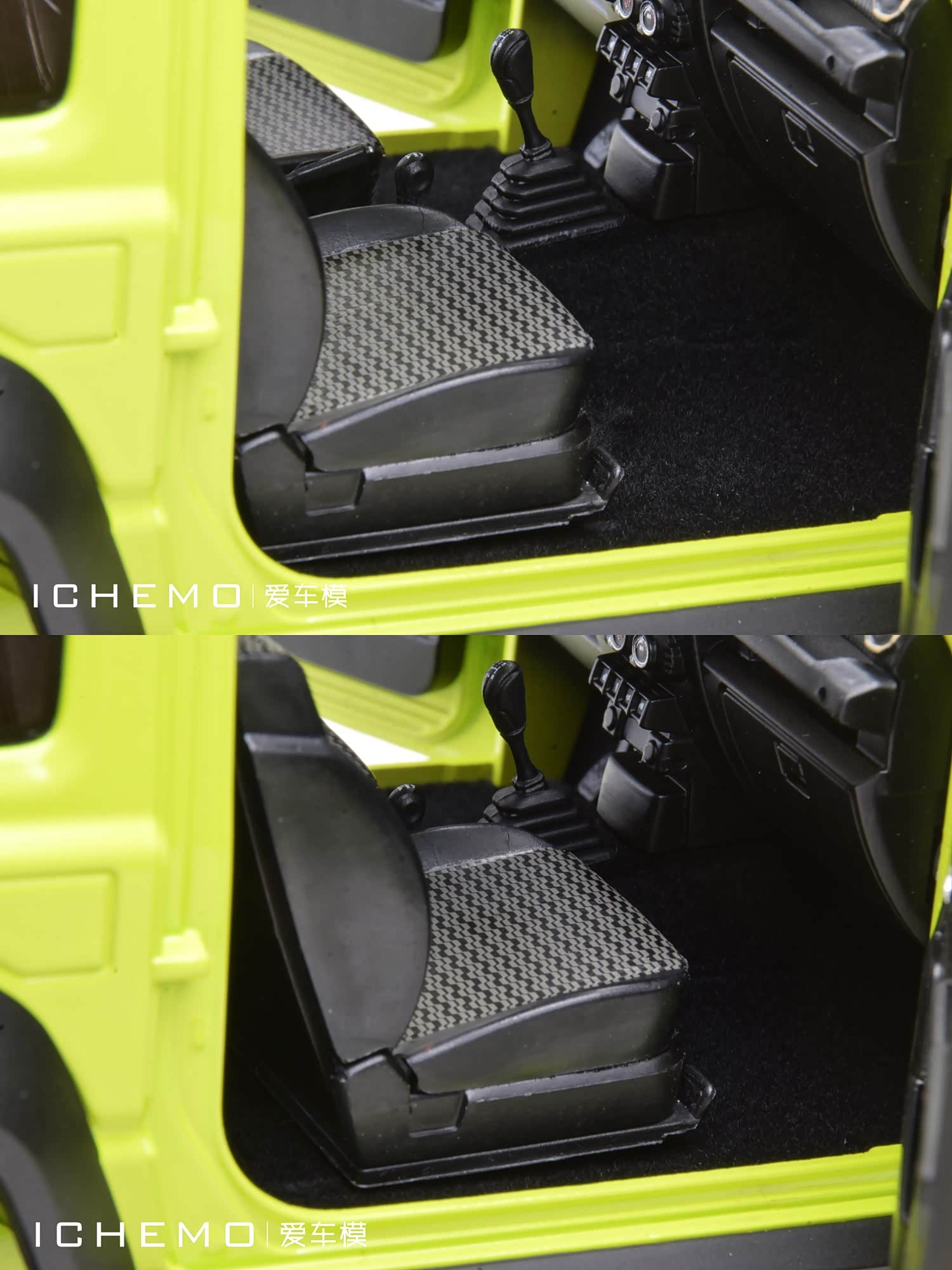 BM Creations 出品 1:18 比例合金全开工艺 Suzuki Jimny Sierra(JB74)汽车模型;模型两侧车门/发动机盖/尾门可打开;模型四轮带“避震”功能,且四轮可拆卸;模型前/后保险杠、前脸中网格栅可拆卸。本文所摄模型实物为量产上市版,模型车身配色为 Kinetic Yellow + Bluish Black Pearl 3 Top 动能黄/珍珠黑车顶(3 门左舵),限量发售 999 台,建议零售价 1280 元/台。