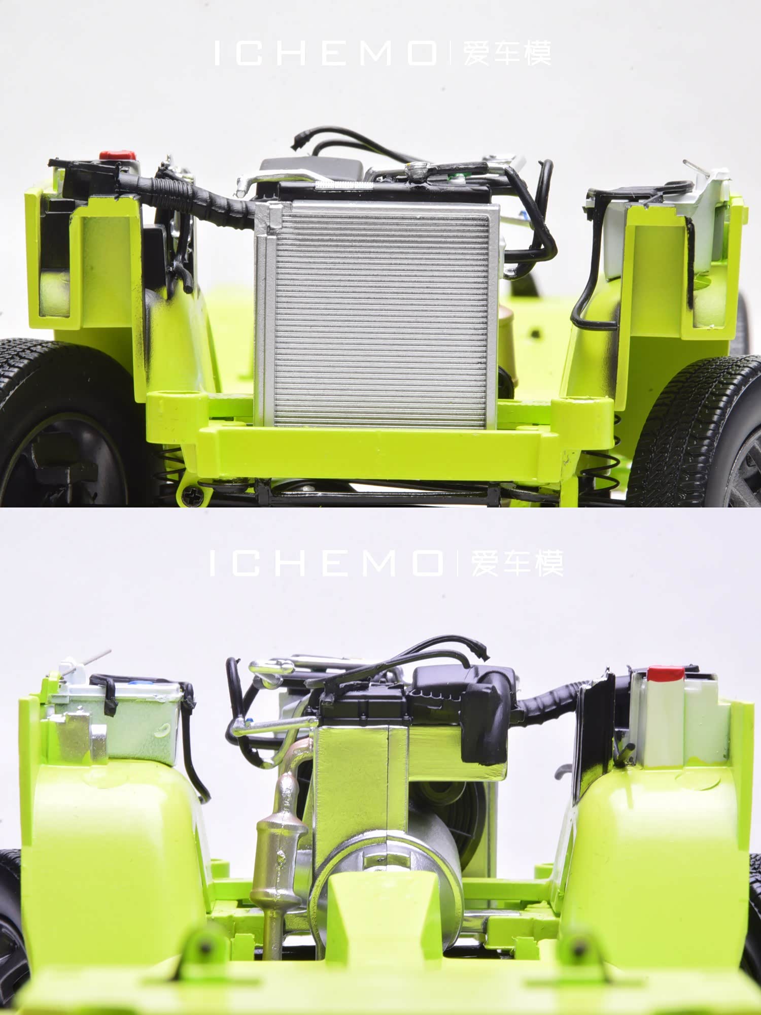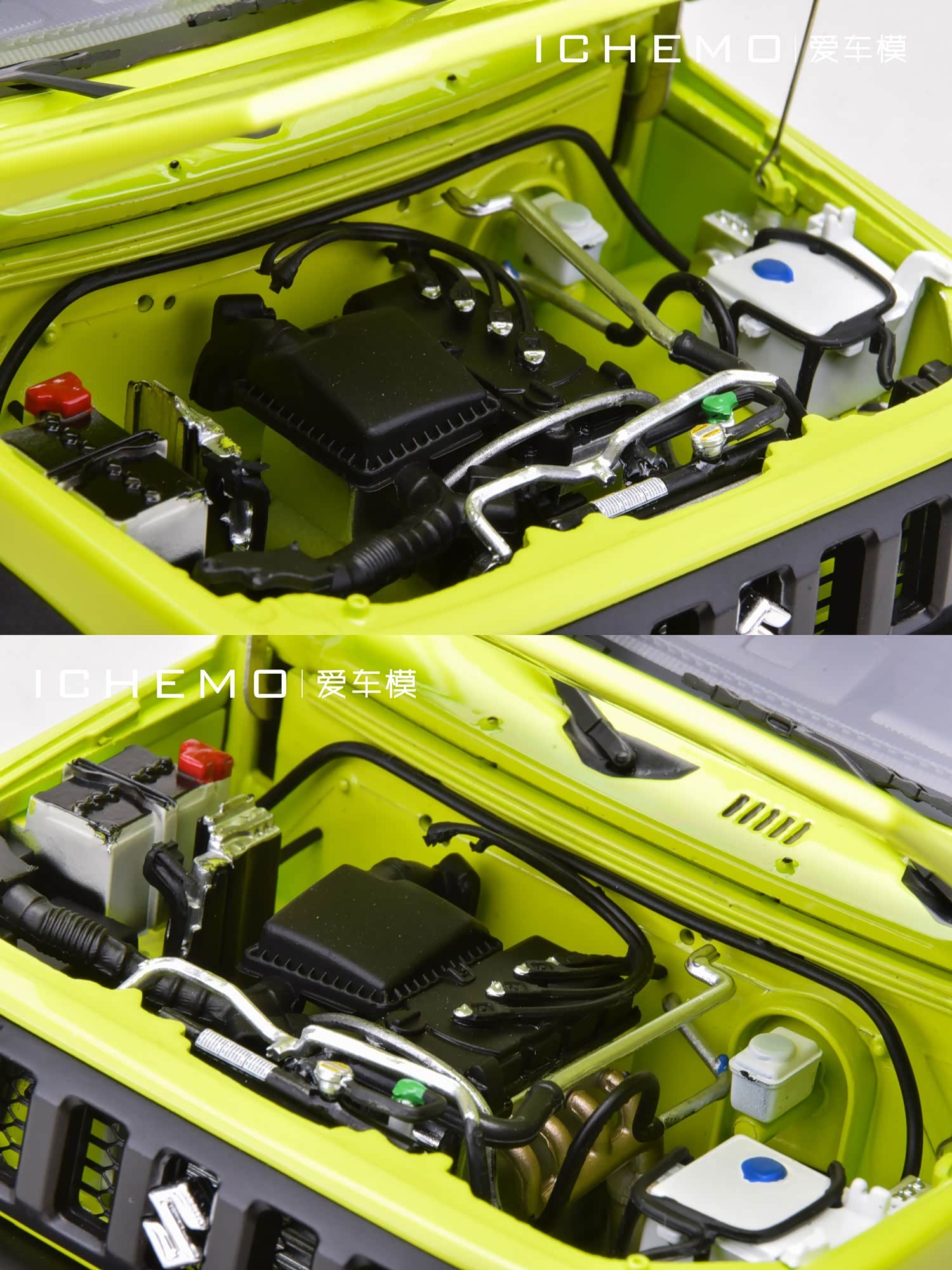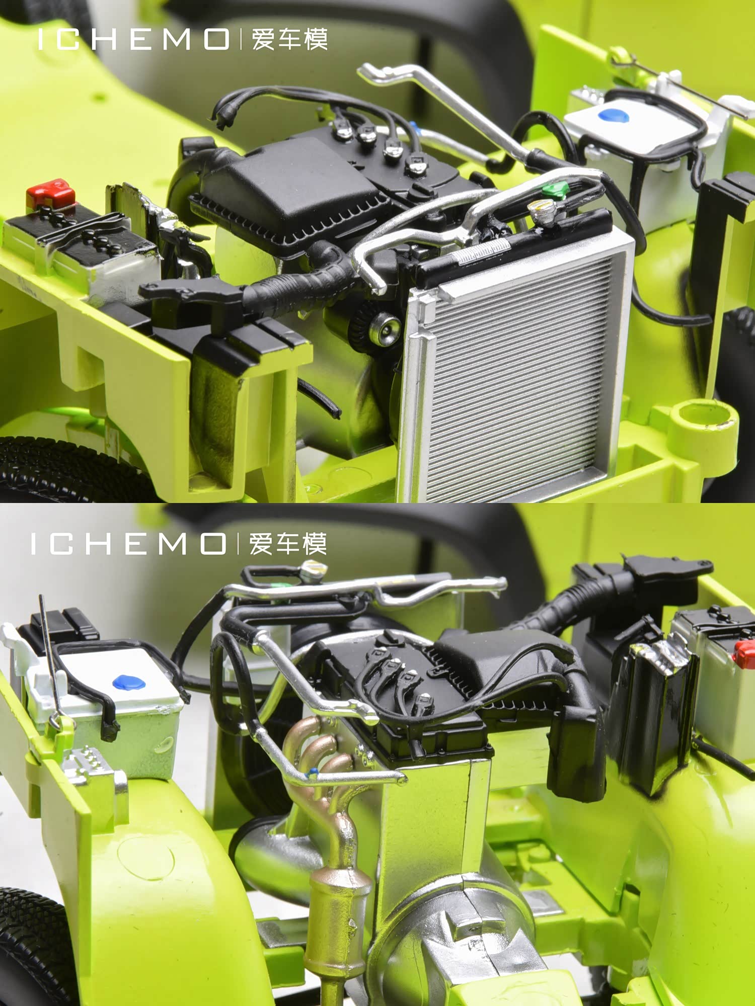 通过拆车可见独立结构的模型发动机/变速箱总成零件,此外还可见模型水箱、防冻液壶、电瓶、进气道等等细节。