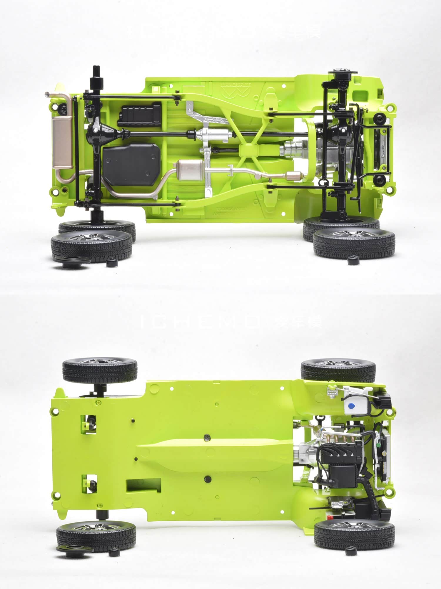 将模型拆解即可更清楚地欣赏模型底盘的细节,不过 BM Creations 将车体独立底板(塑料材质)和车架(合金材质)烫封在了一起不便拆卸。