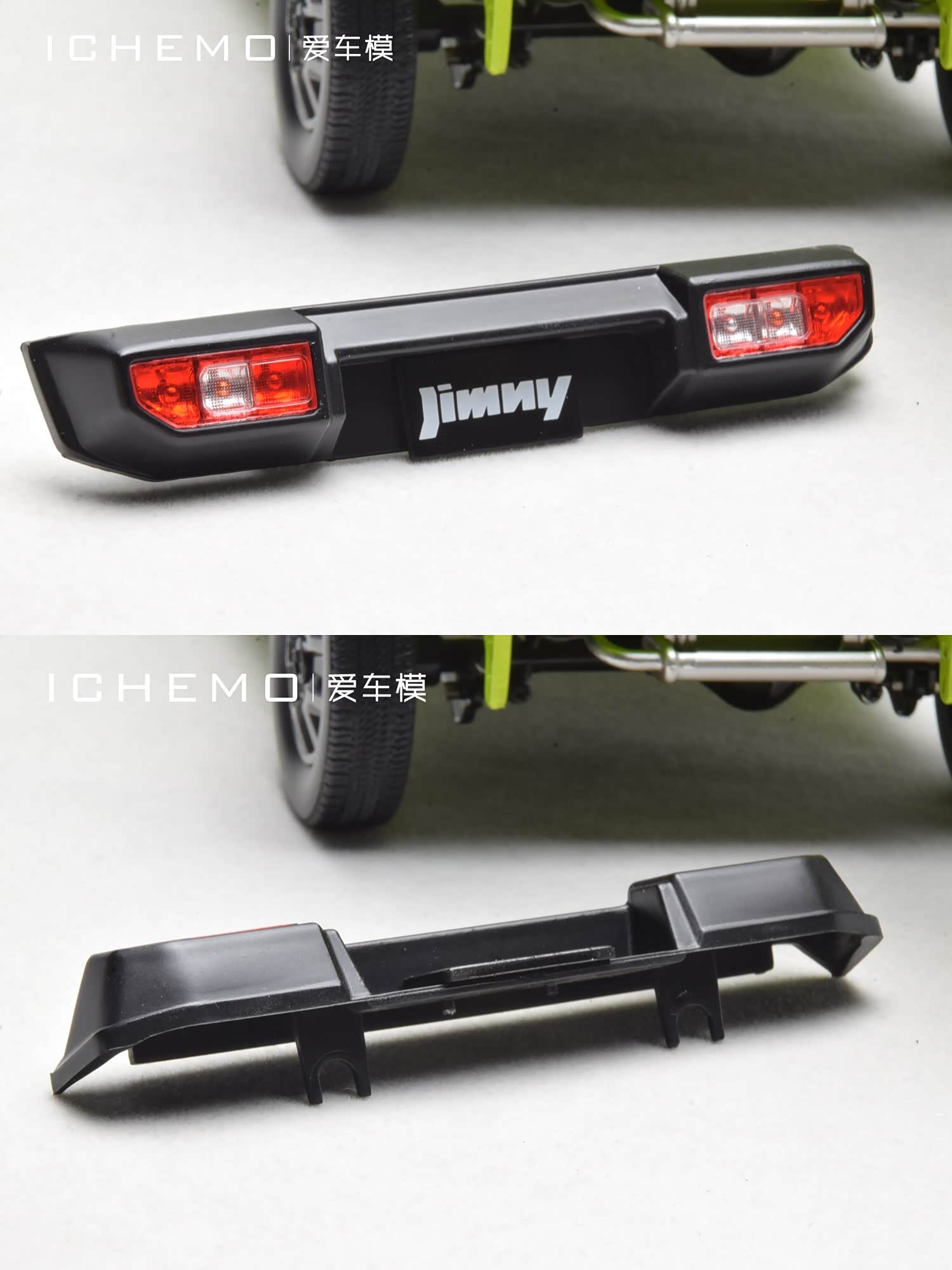 模型前/后保险杠零件通过螺丝拧紧固定在车架上,其材质均为塑料。