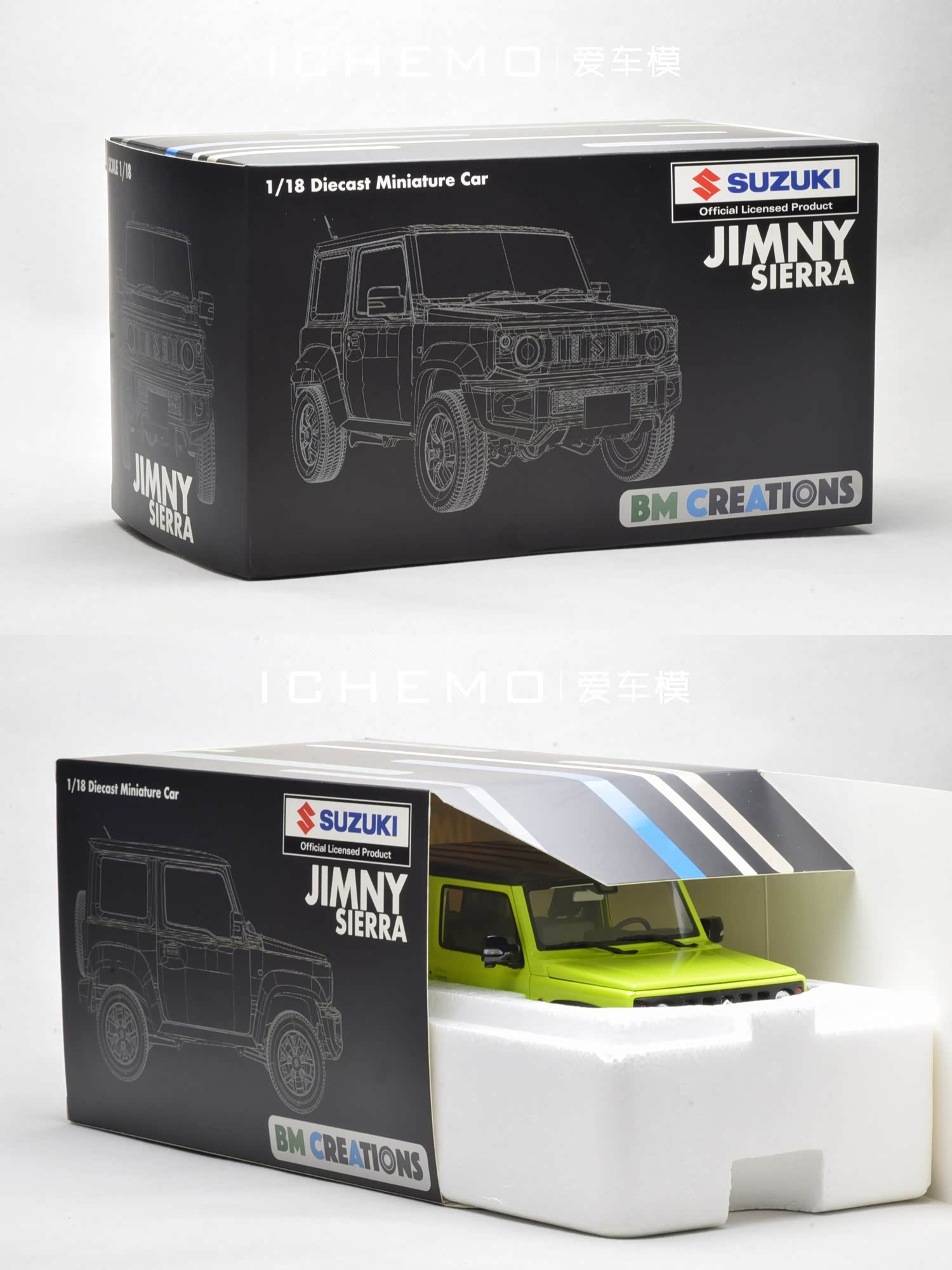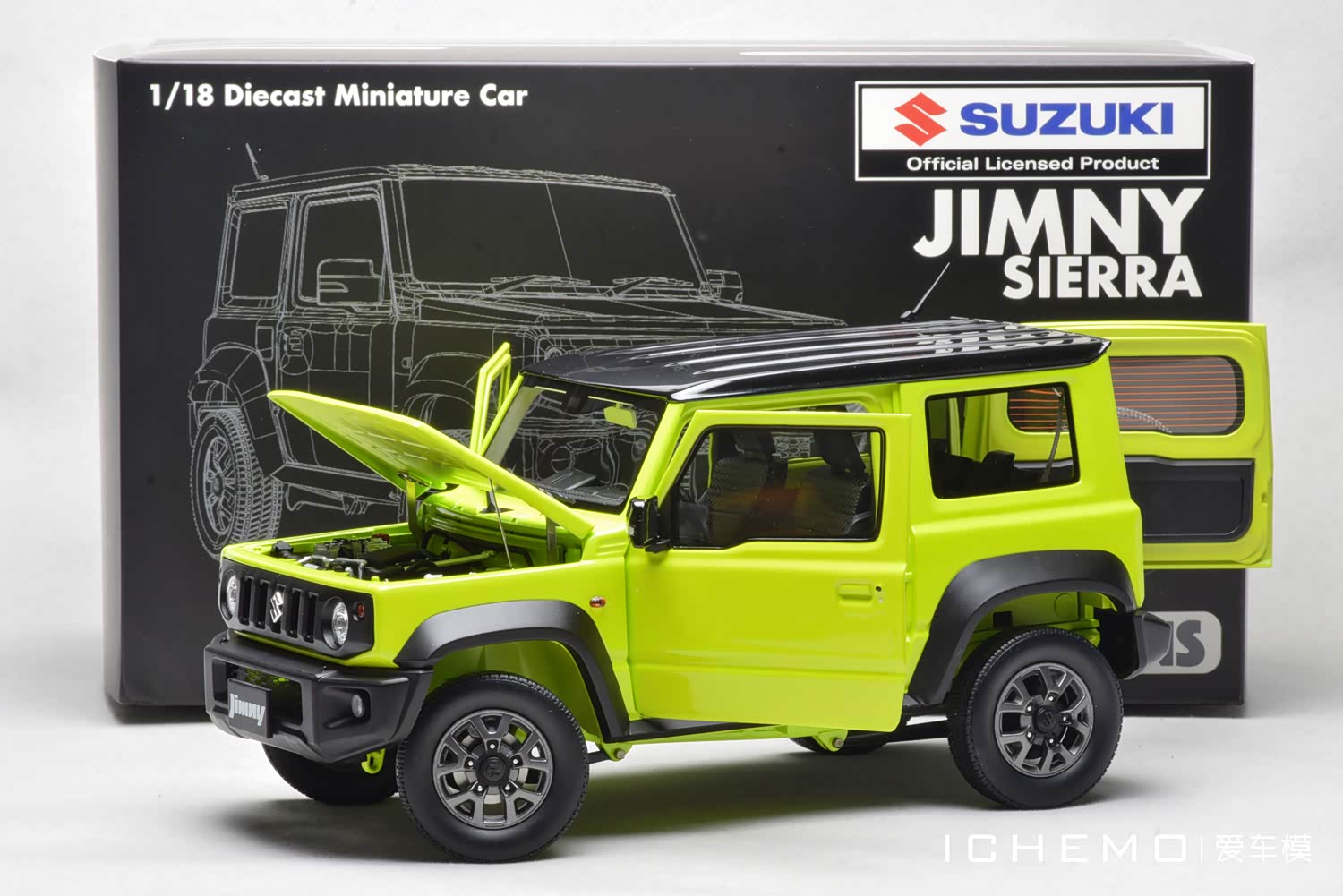 铃木吉姆尼 Suzuki Jimny(第四代)可称时下最热门静态比例汽车模型选题之一。在各模型厂牌 1:64 小比例的“轮番轰炸”后,BM Creations 出品的 1:18 比例合金全开工艺 Suzuki Jimny Sierra 汽车模型终于上市了。